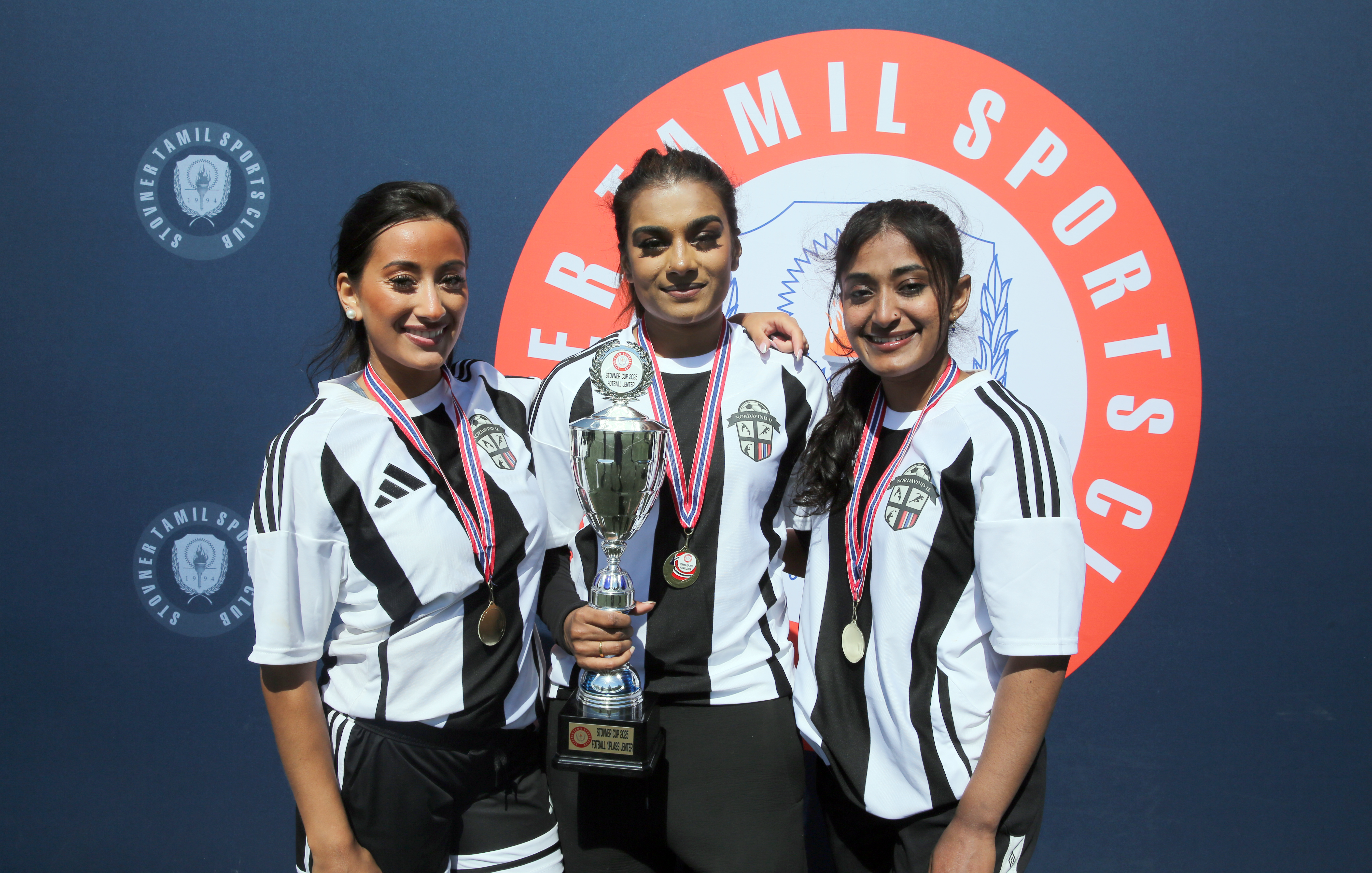 GLADE VINNERE: Mathumeetaha Mikkelsen (f. v.), Swaathy Sasiharan og Vaishi Selliah fra Nordavind IL smiler med pokalen etter å ha vunnet U-21 finalen med 1-0 over Star Eleven, som ble spilt allerede helga før selve fotballfesten på Rommensletta. FOTO: Rolf E. WulffBilde 1 av 5