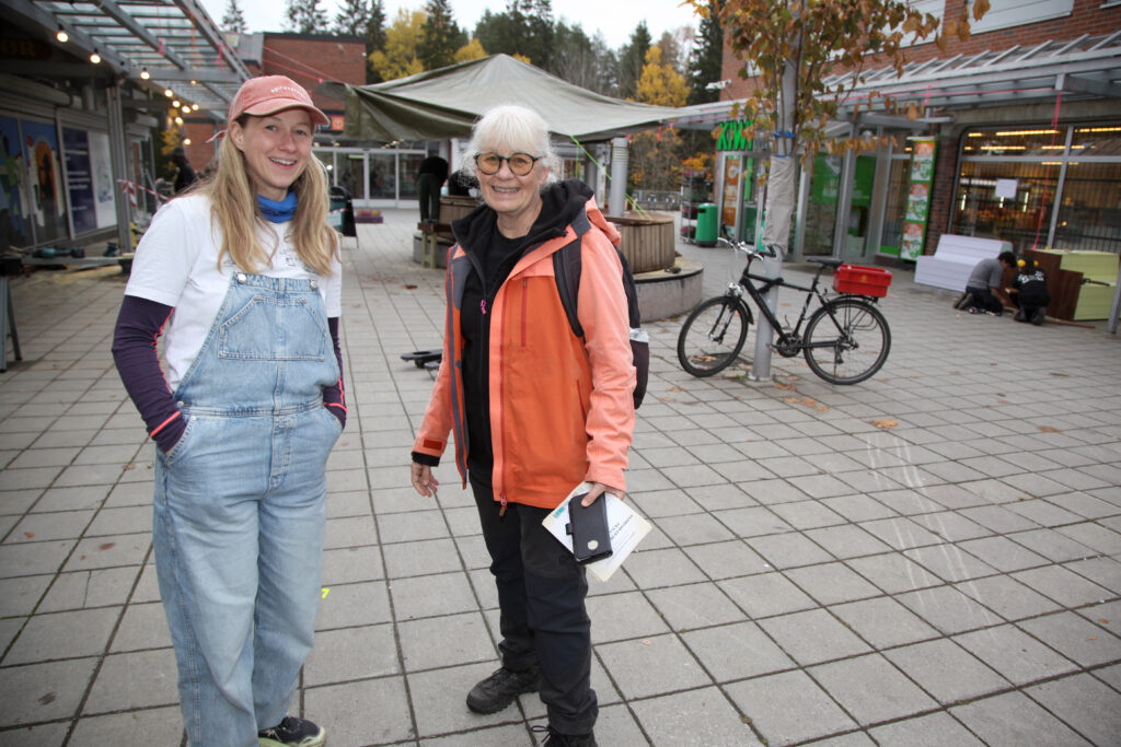 FORNØYD VETERAN: Astrid Kjellevold (t. h.) har vært innblandet i mangt og meget på Ellingsrud. Hun er svært begeistret for hvordan det nå blir på Ellingsrud torg og takket prosjektleder i Spireverket, Karoline Olimb, for innsatsen. FOTO: Rolf E. Wulff