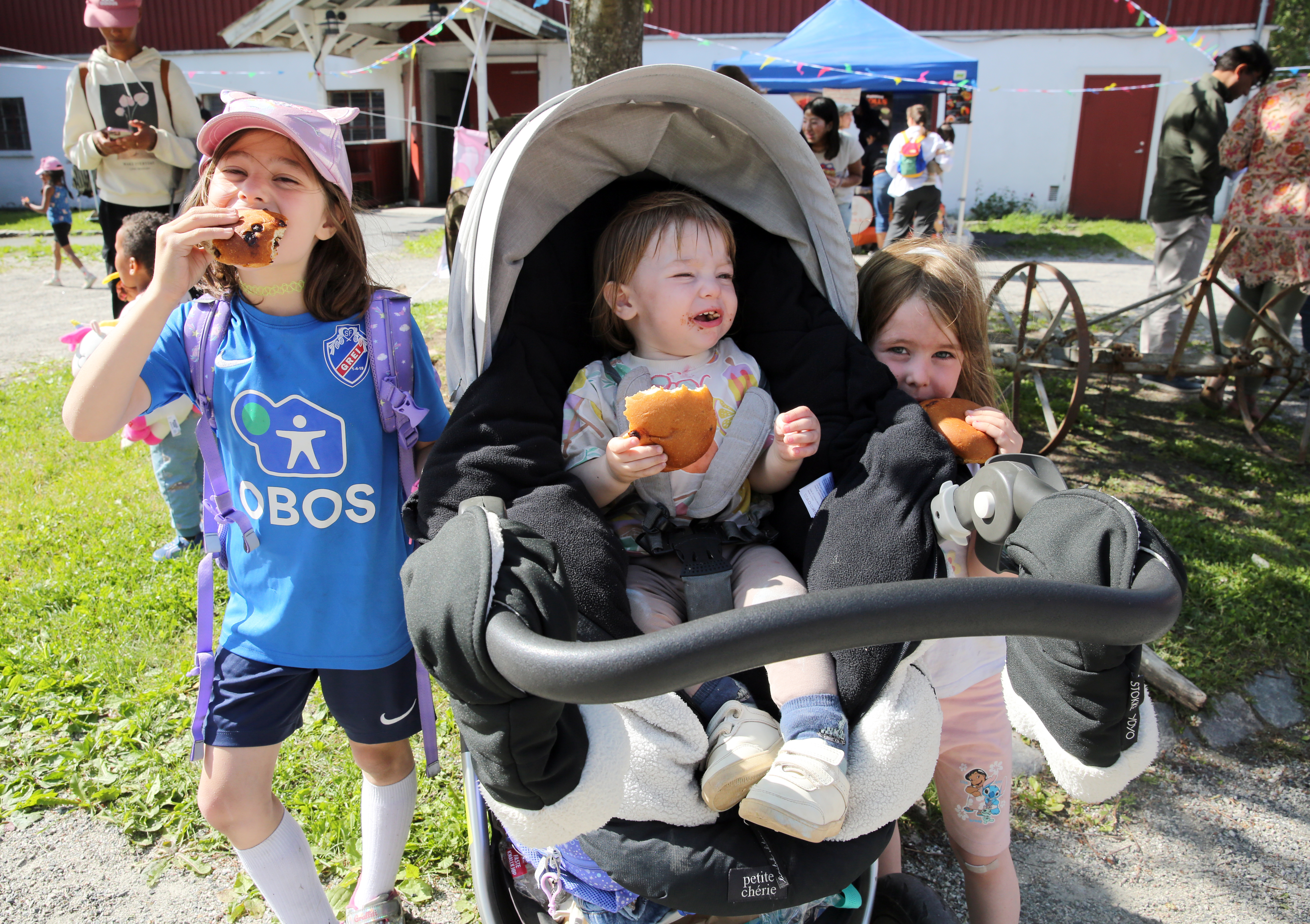 LYKKELIGE BOLLESPISERE: Lea (7), Pavle (1) og Tara (5) nøyde seg med en god gammel bolle på matfestivalen – men det smakte like godt som alt annet som ble tilbudt på Nordtvet gård. FOTO: Rolf E. WulffBilde 1 av 19