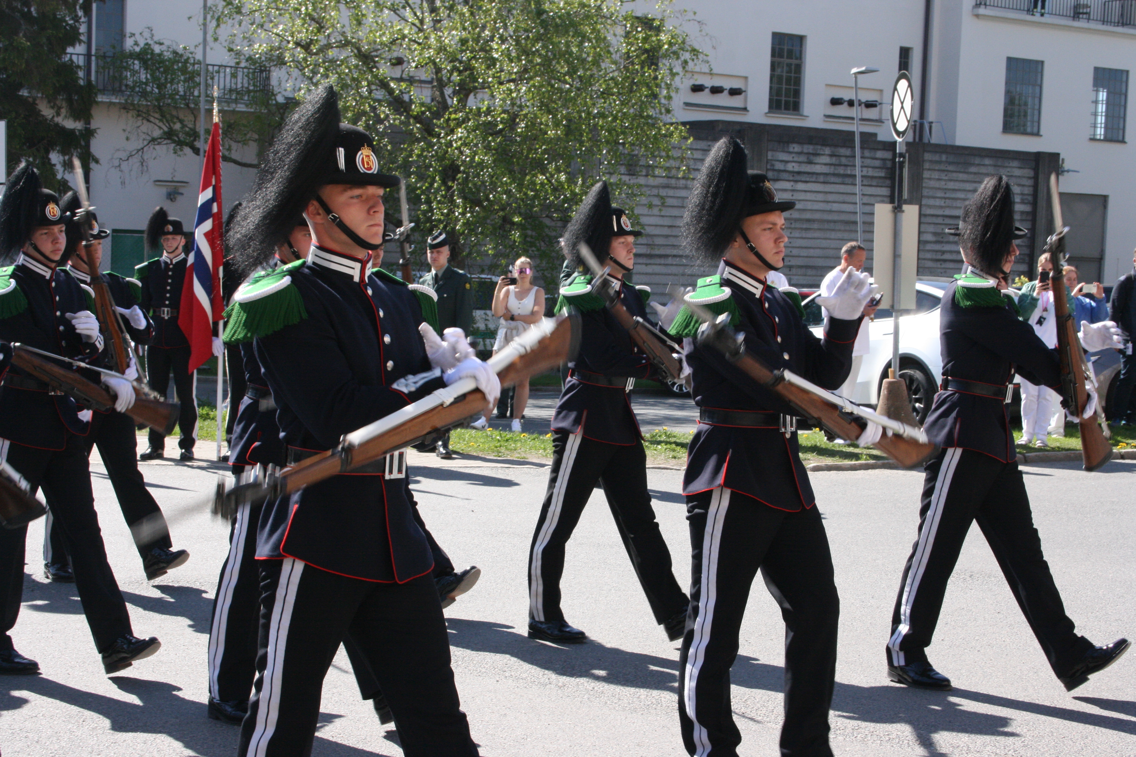 På Aker sykehus var det en stor gjeng som hadde samlet seg i solskinnet og varmen ute. Det var ansatte på sykehuset, pasienter og besøkende som sto tett i tett for å se de unge, talentfulle gardistene i drillkompaniet vise fram kunstene sine.