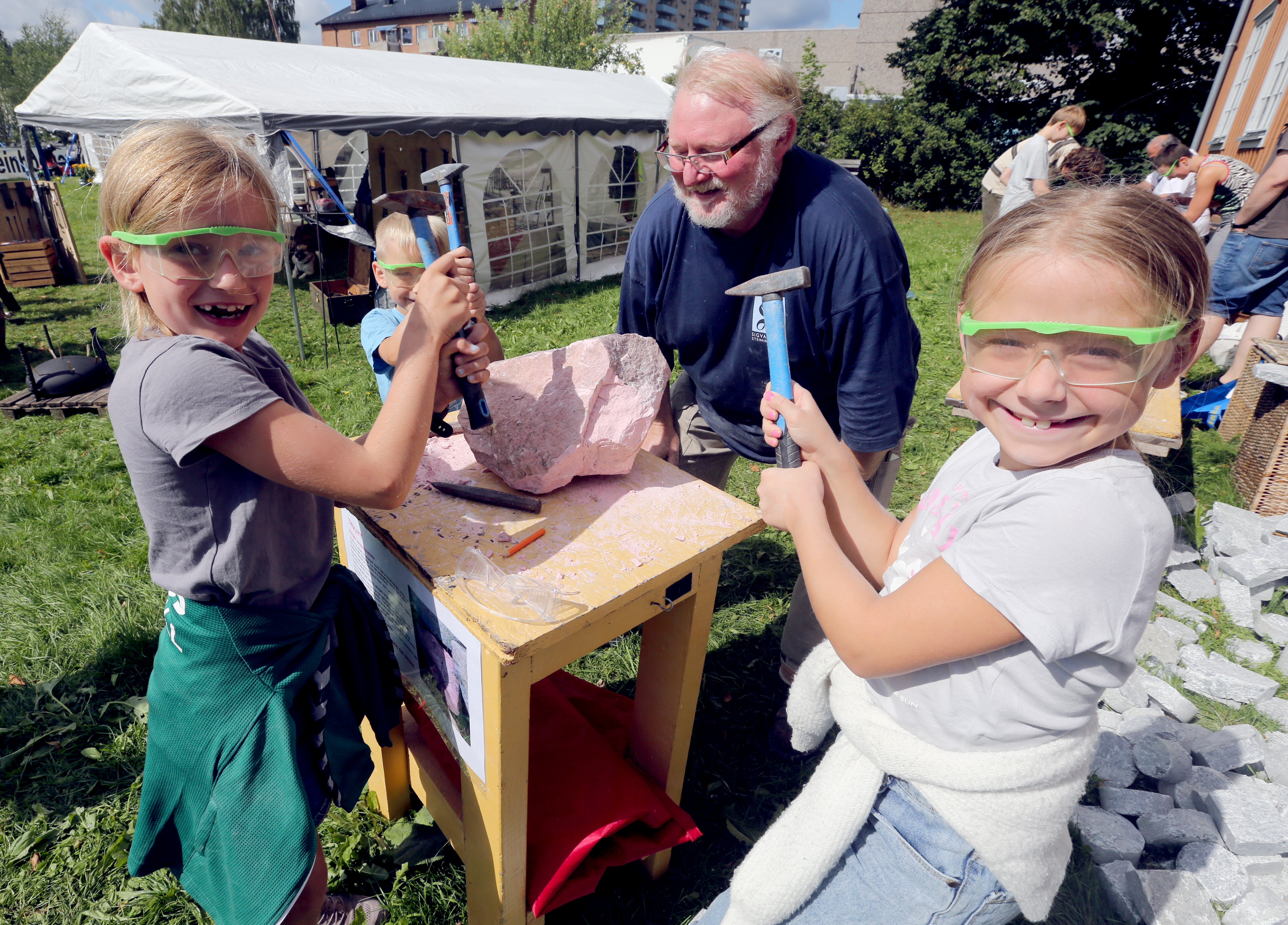 Det skorter ikke på innsatsen til Amelia (8), Eivor (8) og Isak (7). Med beskyttelsesbriller på og med skikkelig verktøy i hendene gyver de løs på en solid stein.