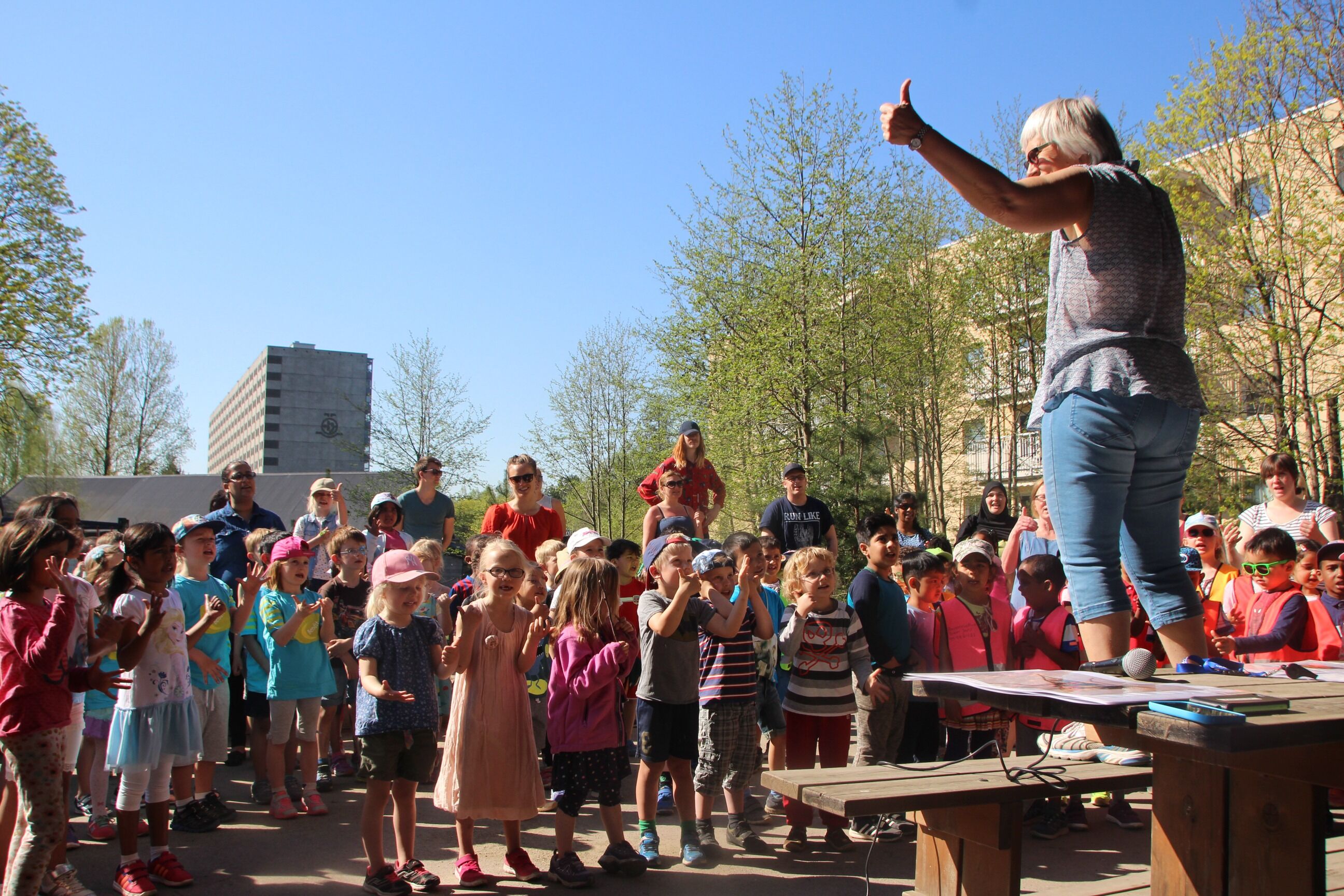 SYNGER SAMMEN: Alle barna samlet seg utenfor Ammerudenga barnehage for siste fellesøving med språkpedagog Kari Hatlen. Foto:Bilde 1 av 1 130 barn sammen om stor sangglede Martine Myhre Publisert 19. mai 16 kl. 16:00 Del på sosiale medier Del Facebook Twitter E-post Abonnement