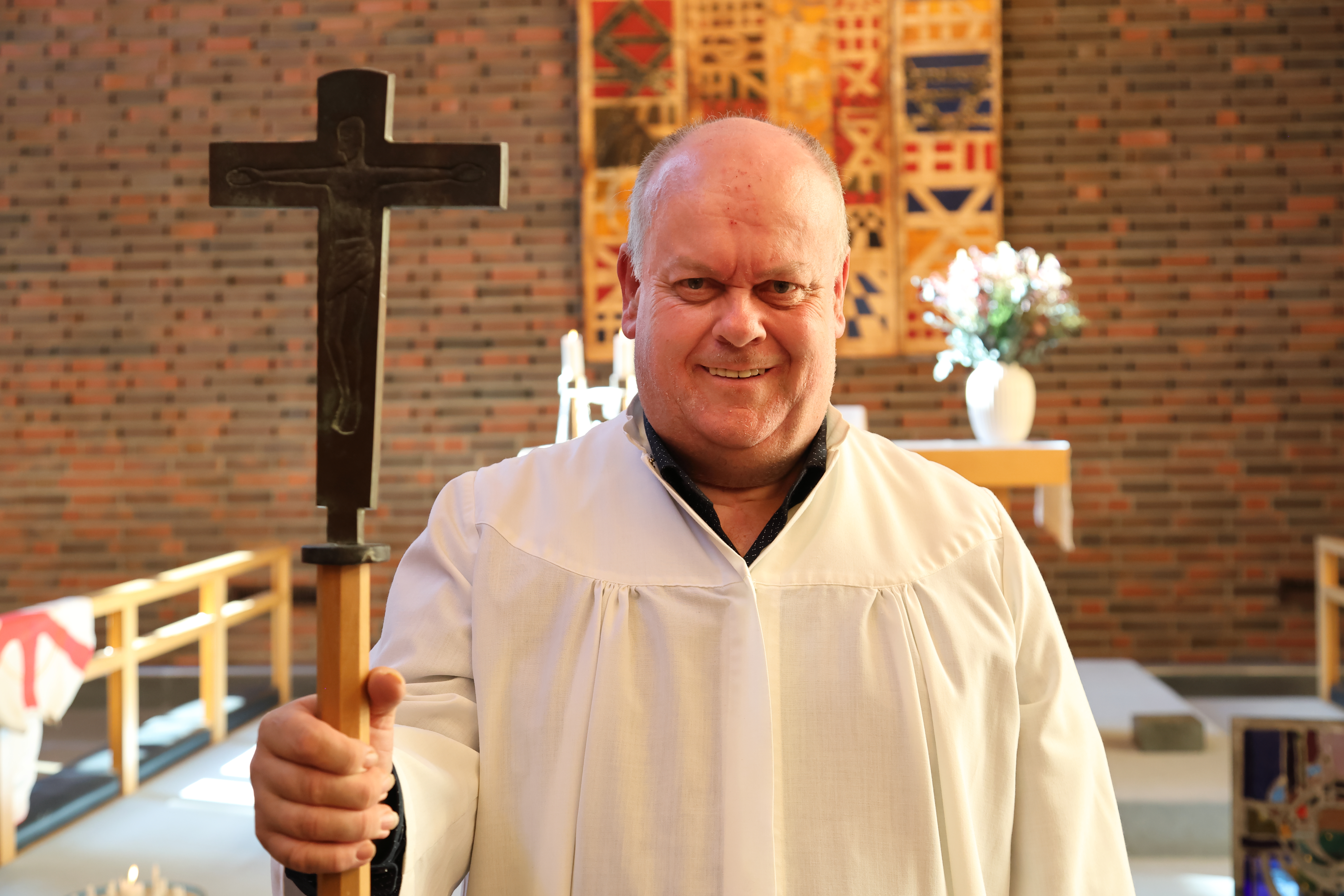 Rune Vidar har båret korset gjennom kirkens midtgang i 30 år. Med kake, sanger og varme ord ble han nylig feiret av en entusiastisk menighet i Rødtvet kirke.