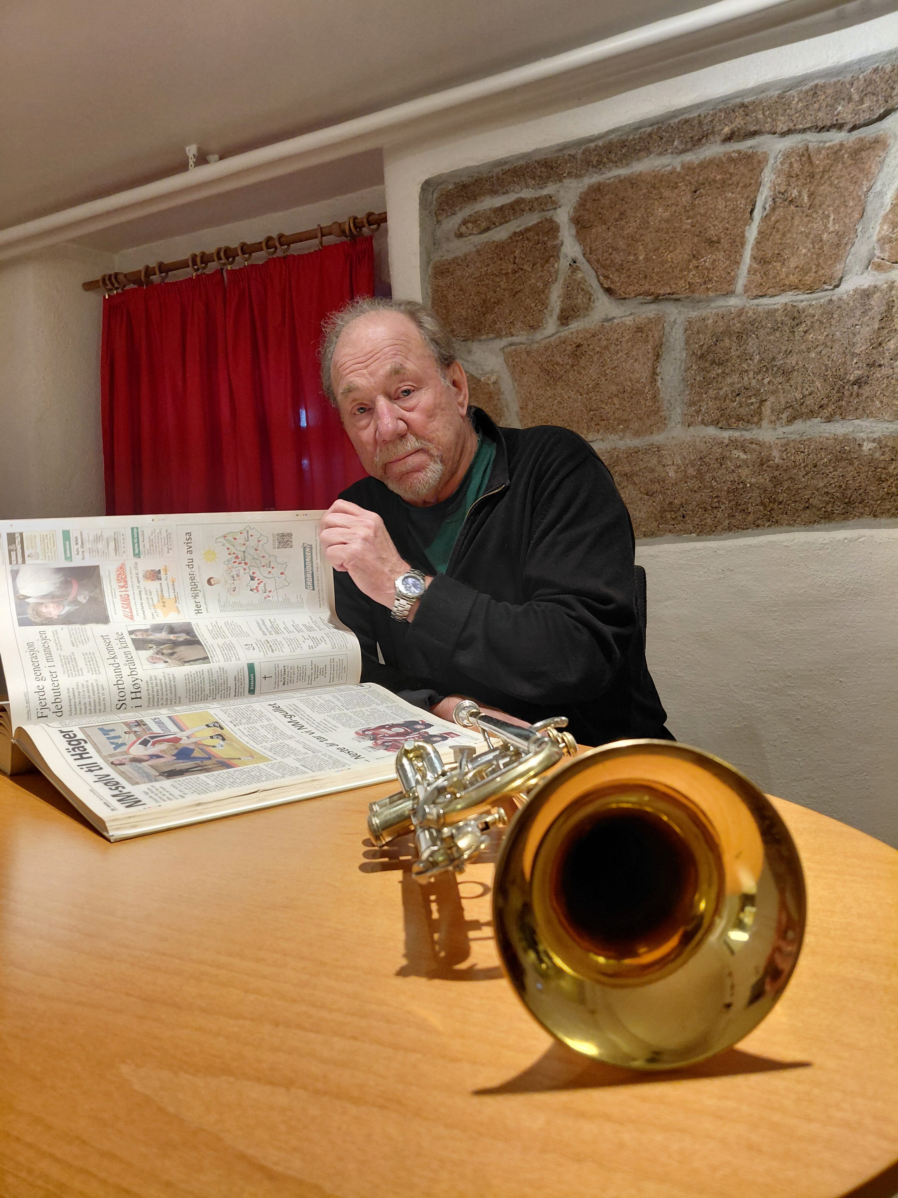 40 ÅR MED STORBANDHISTORIE: Rune Wold blar i gamle avisutklipp fra Romsås Storband sin historie – med trompeten innen rekkevidde. Etter 40 år som leder gir han nå stafettpinnen videre. FOTO: Martine Myhre Shurdhiqi