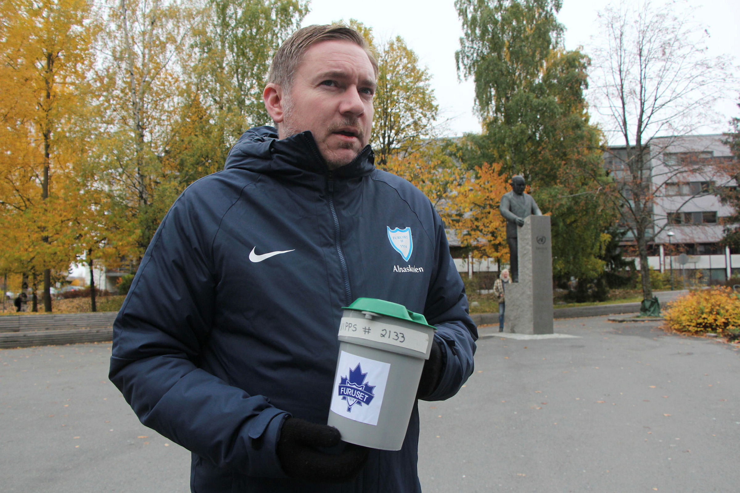 FOR FÅ KRONER OG MÅL: Furuset og Lørenskog har nylig spilt mot hverandre i 1. divisjon for herrer, hockey. Under lørdagens kamp på Furuset ble det avholdt en liten konkurranse mellom supporterne; hvilken supportergruppe gir mest til bøssa? Lørenskog vant både på isen og i antall kroner i bøssa. Her med Anders Moe Kristiansen.