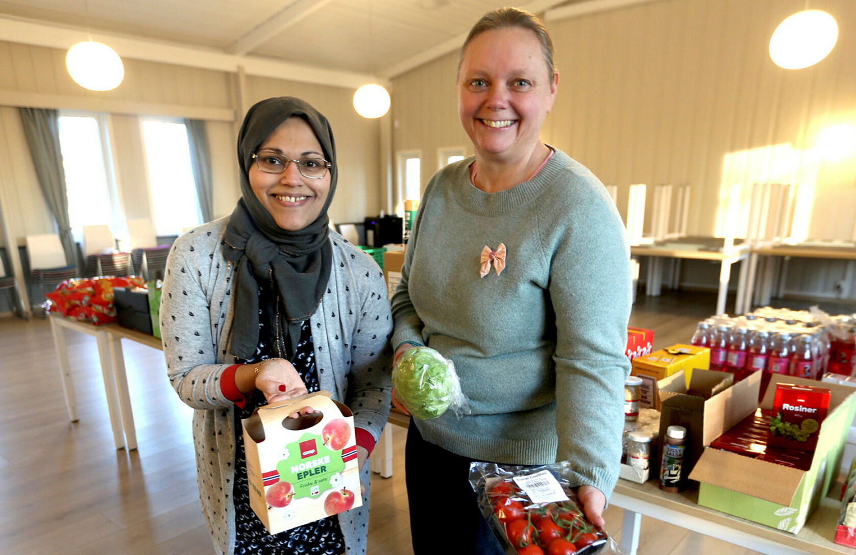 Hun står sammen med Anne-Beth Grihamar i menighetshuset ved Østre Aker kirke, hvor de deler ut matposer til dem som trenger det i nærområdet for Ulven, Fjellhus, Teisen og Bryn.