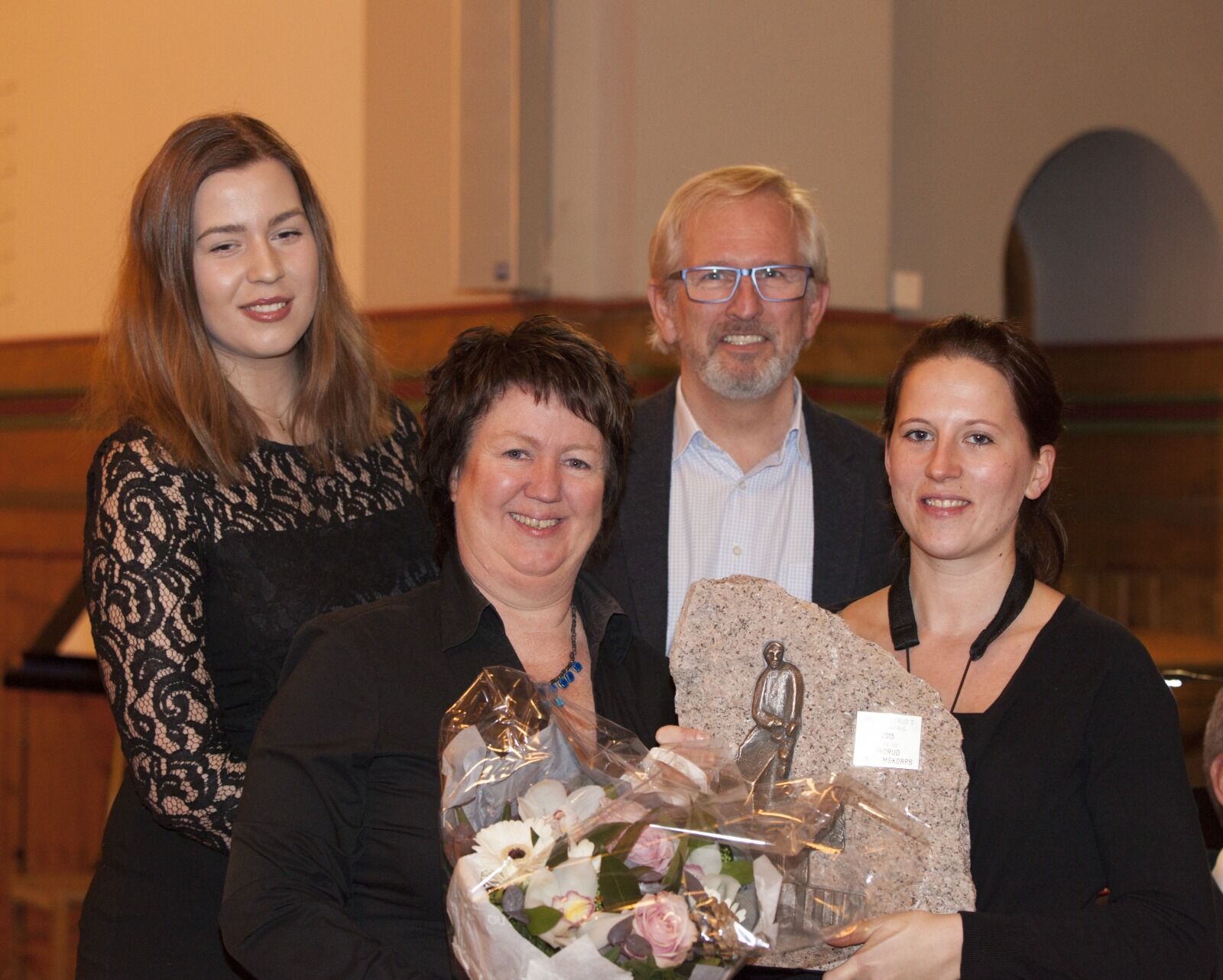FIKK KULTURPRISEN: Korpsleder May Bøhren (f.v.) og korpsmedlem Jeanette Rolijordet Halvorsen tar imot Grorud kulturpris på vegne av Grorud Ungdomskrops. Her med leder Andrine Beiner Johansen (bak f.v.) i bydelens kulturkomité og kulturkonsulent Jørn Linnerud. Foto: Tom EvensenBilde 1 av 1