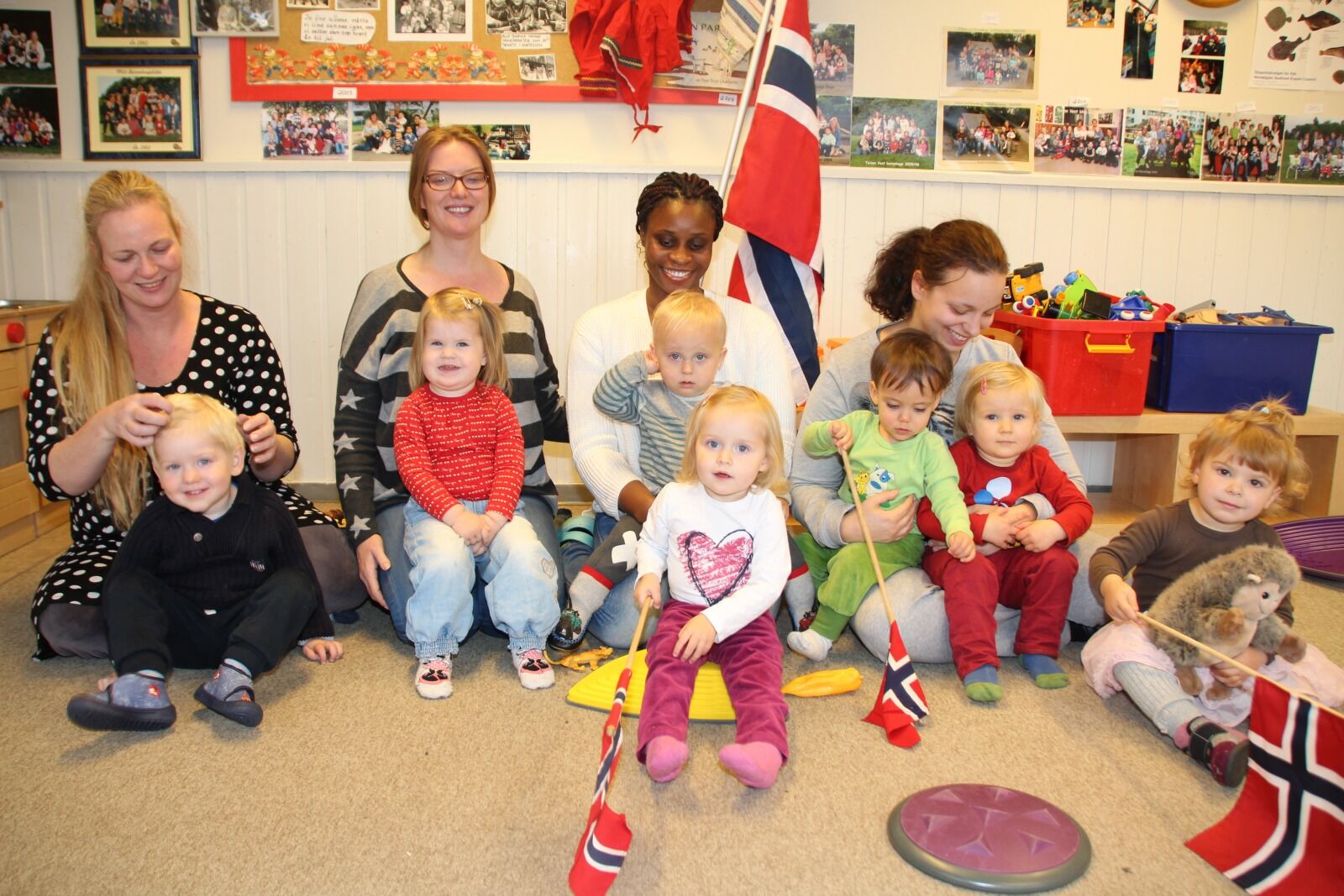 BURSDAGSFEST: Barna fra Teisen Vest barnehage feiret 60-årsdagen til barnehagen. Det var med leker, utstilling - og flagg. Foto:Bilde 1 av 1
