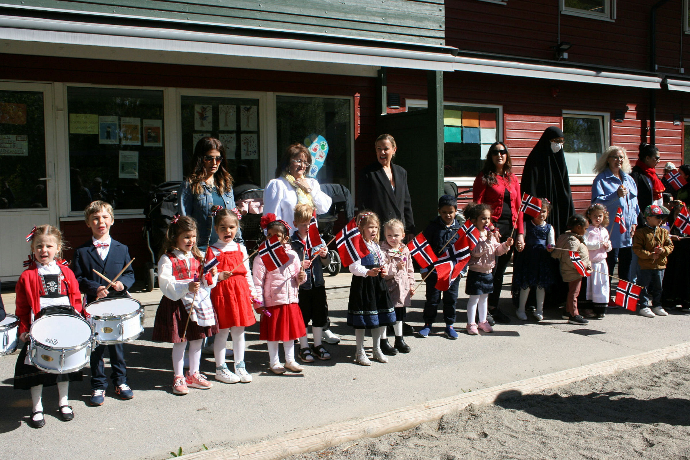 Barnehagene ved Fossum åpnet 17. mai-feiringen en dag på forskudd. Anført av Stovnerhøgdas splitter nye tromme- og kazookorps tok de fire barnehagene en skikkelig runde i nabolaget.