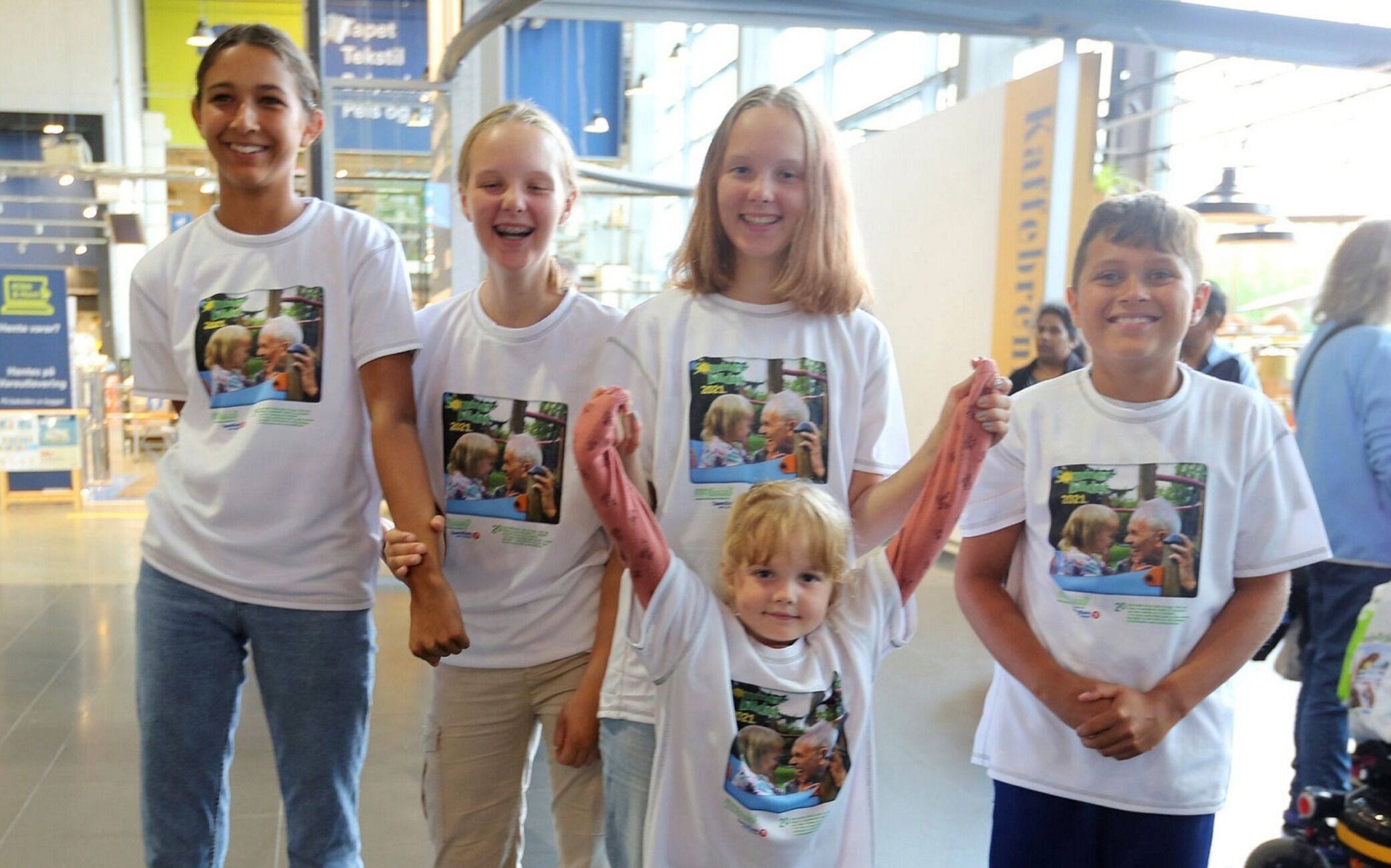 BERGENGJENG: Linnea Håland (f.v.), Emilie Berland, Sara Berland, Niklas Håland og Emma Berland (foran) hadde kommet til Alna fra Bergen. Med seg hjem fikk de en t-skjorte som takk for innsatsen. Foto: Rolf E. Wulff
