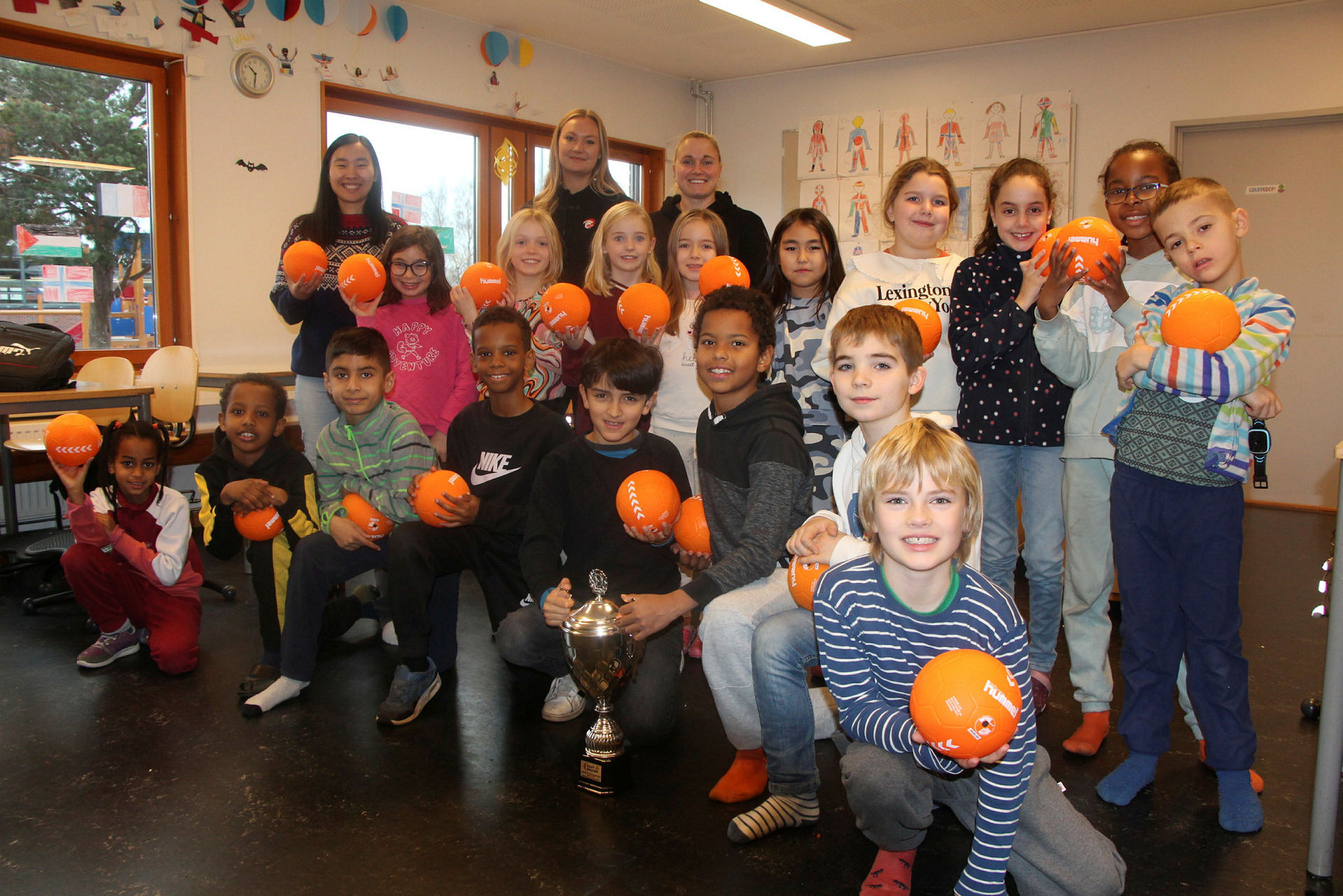 Det var Celina Torp og Ida Sanden Åsmyhr fra Norges Håndballforbund Region Øst som overrakte pokalen til 3A. 7- og 8-åringene var svært energiske da pokalen ble overrakt.