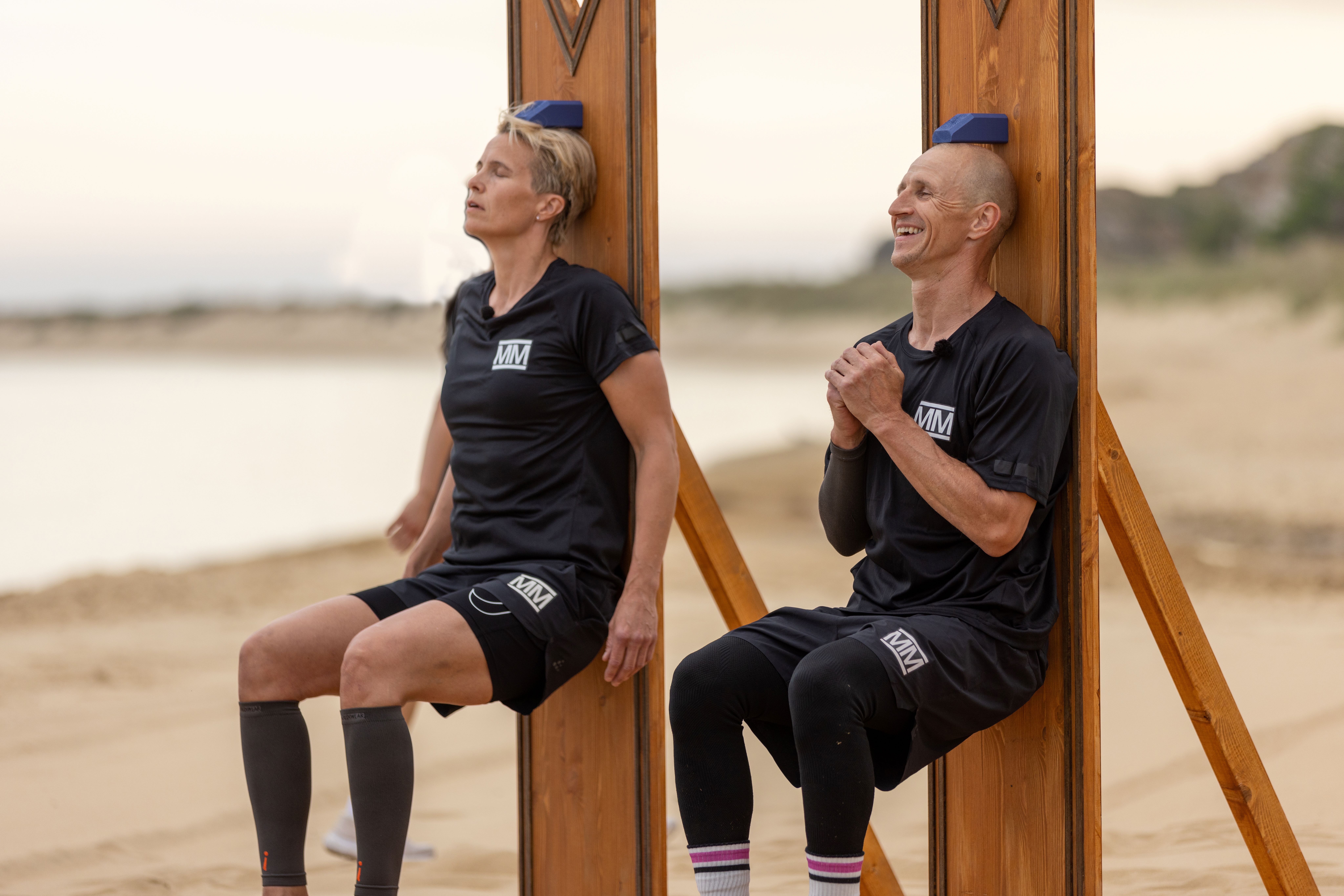 LEKTE SEG: Birgitte Lersbryggen hadde full kontroll på konkurrentene sine i øvelsen 90-grader og var den som satt lengst med 7 minutter og 4 sekunder. Det er et stykke opp til «Pølsa» som satt der i en time. FOTO: Alice Asplund, Nordisk Banijay/NRKBilde 1 av 2