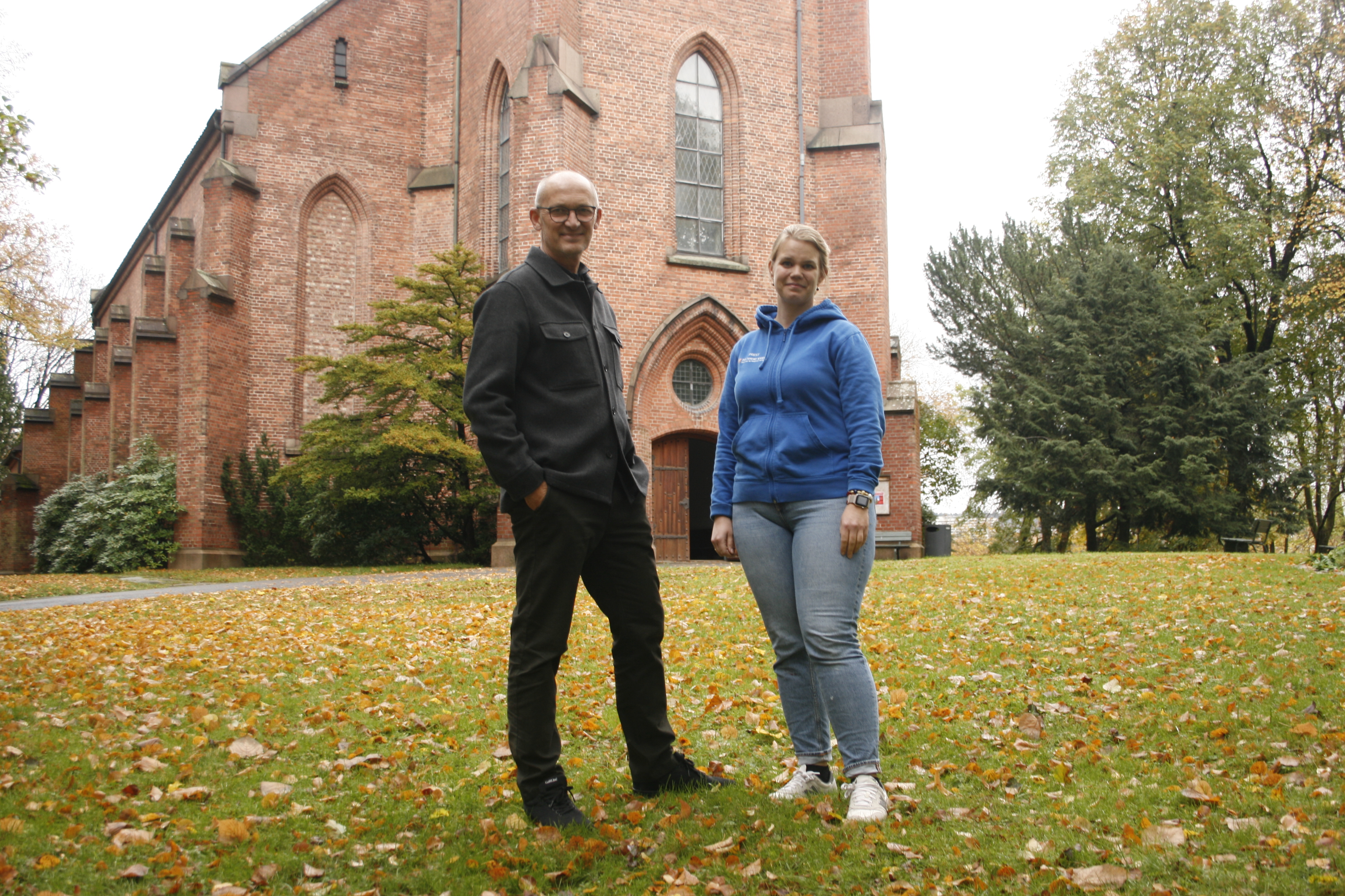 OPPDAG KIRKEN: Sokneprest Thomas Berbom (t.v.) og kapellan Annette Dreyer inviterer voksne som ønsker en litt annen halloween-feiring velkommen til vandring i Østre Aker kirke.Bilde 1 av 1