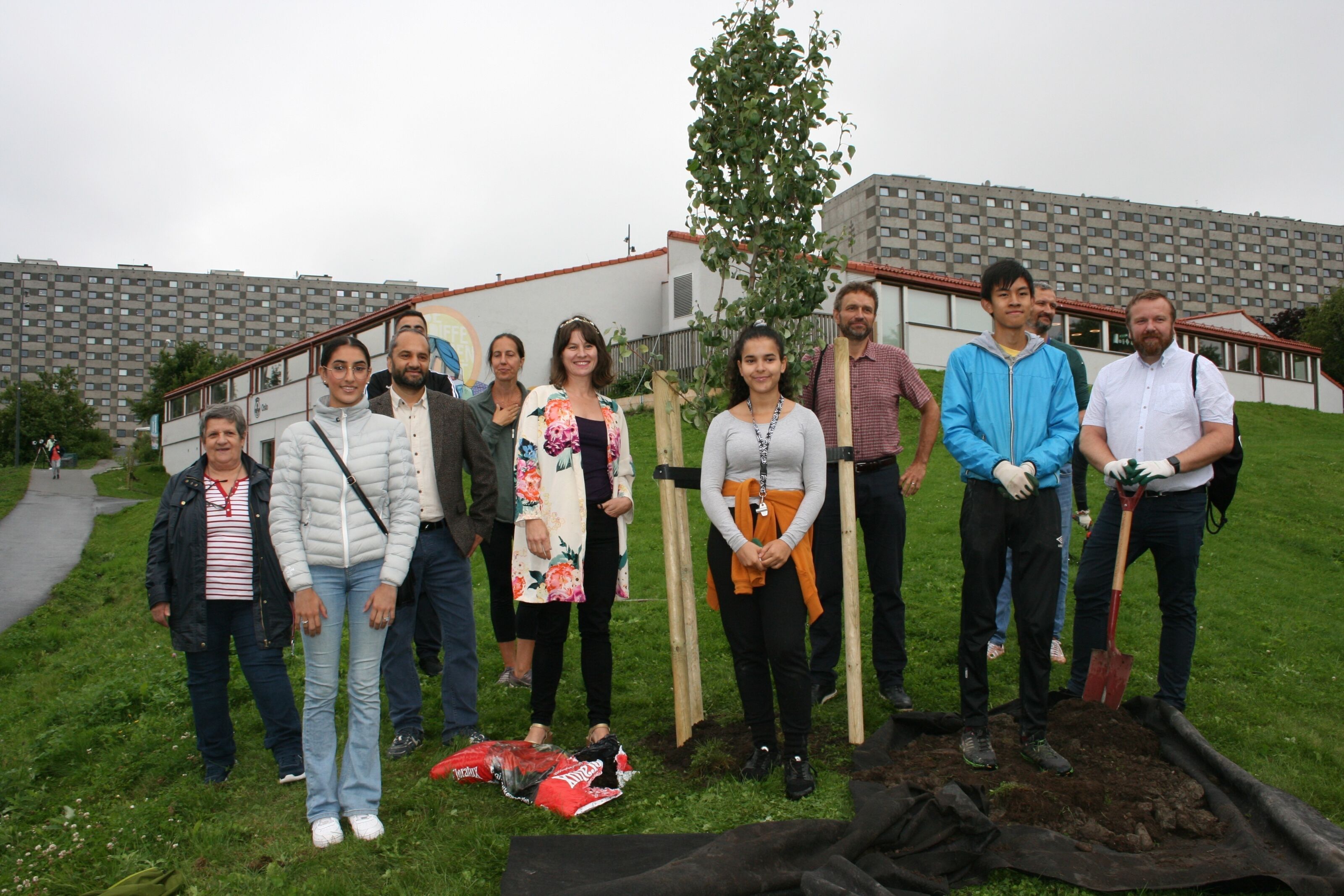 Bak Ammerudklubben har det i hele sommer vokst alt fra tomater, redikker og brokolli til urter. Ungdommer med sommerjobb har hatt ansvar for bygging av vekstbokser, urtespiral og nå planting av frukttrær. Bydel Grorud har satt som mål at det skal plantes 200 frukttrær i bydelen, og byrådene Rina Mariann Hansen (Ap) og Arild Hermstad (MDG) plantet torsdag det første treet av mange.