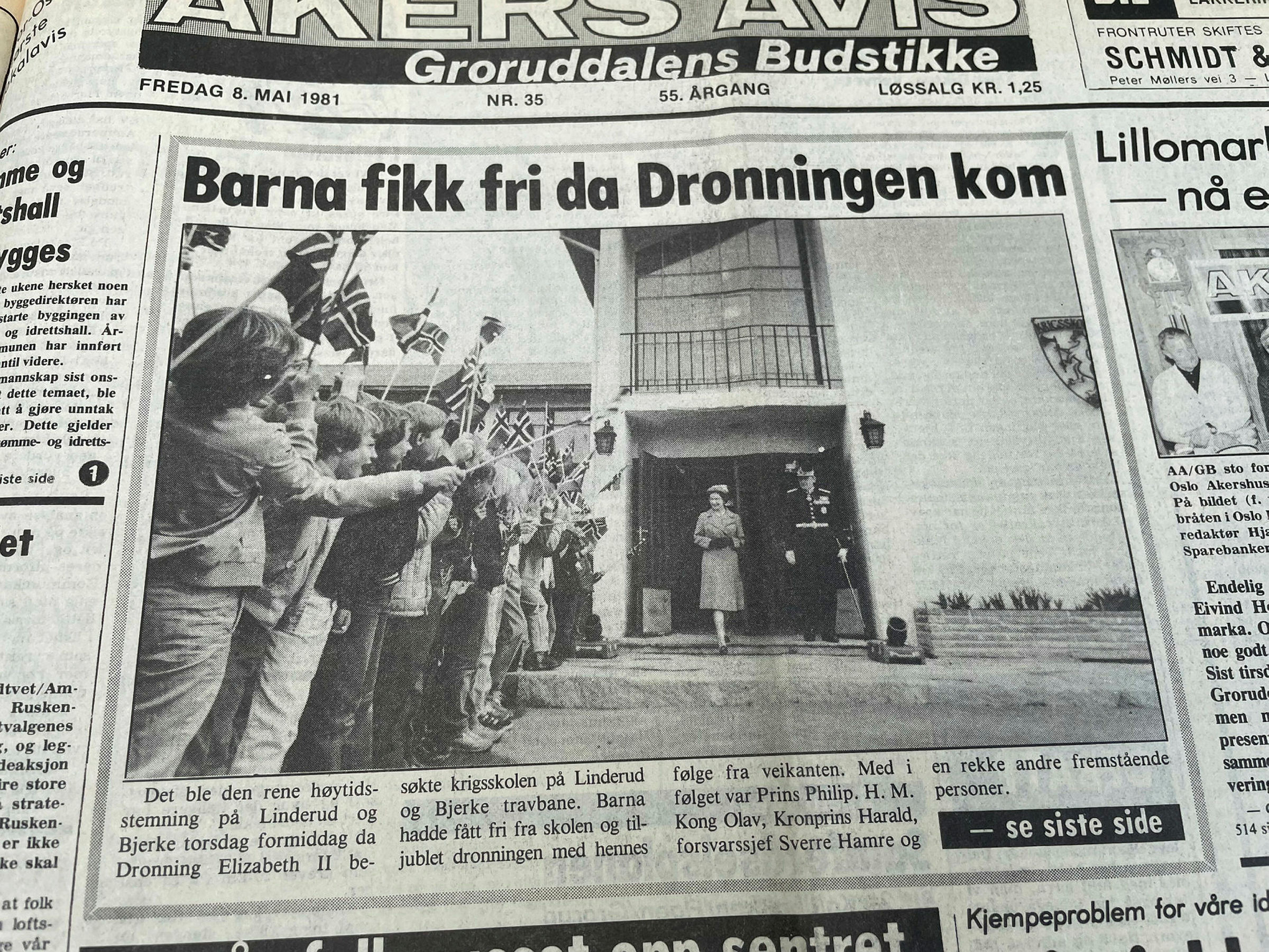 HYLLET: Dronning Elizabeth II ble hyllet med norske flagg fra nærområdets skolebarn da hun besøkte krigsskolen. Foto: ArkivBilde 1 av 1 Dronningen besøkte Groruddalen i 1981, avduket «hesten» som står foran Bjerke Travbane Caroline Hammer Publisert 17. sep 22 kl. 06:00 Del på sosiale medier Del Facebook Twitter E-post Abonnement