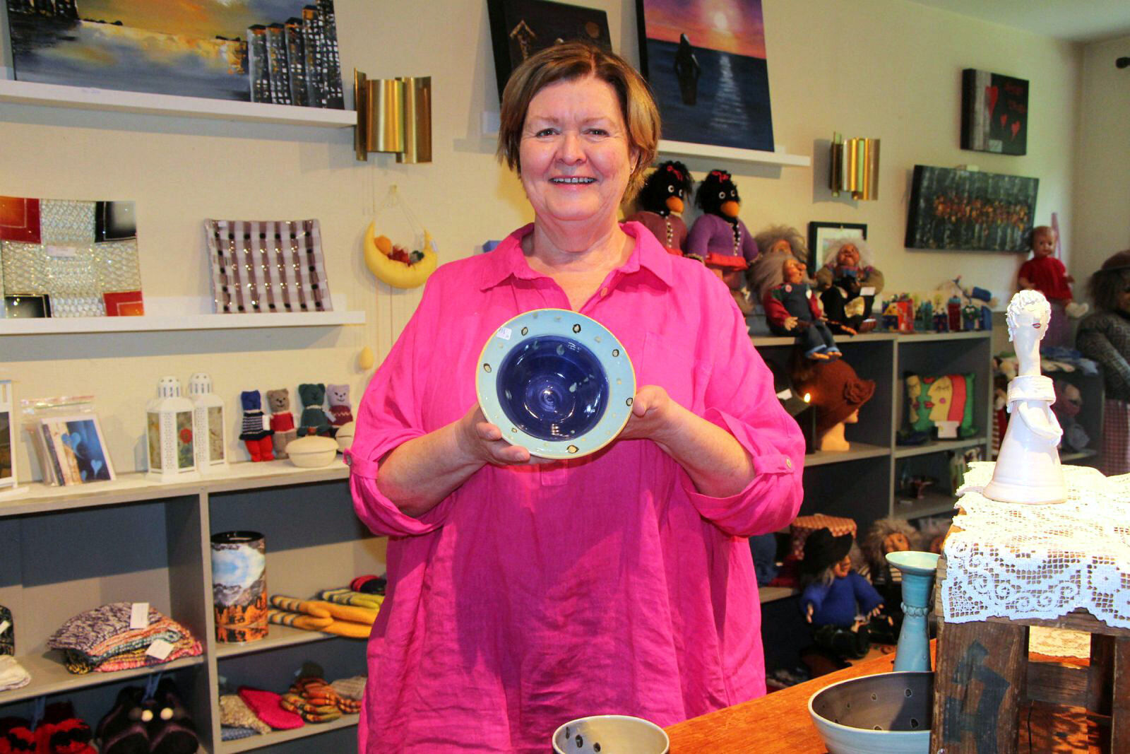 Ingvill Berg Holm er ei dame med mye godt å by på. I disse dager stiller hun ut håndlagd kermamikk i Kulturkjelleren i Ellingsrud kirke, og hun serverer vafler og andre søte godbiter fra kafeen. Utstillingen hennes står fremme i Kulturkjelleren fram til 14. oktober. Det er håndlagd keramikk og består av kopper, skulpturer og mer.