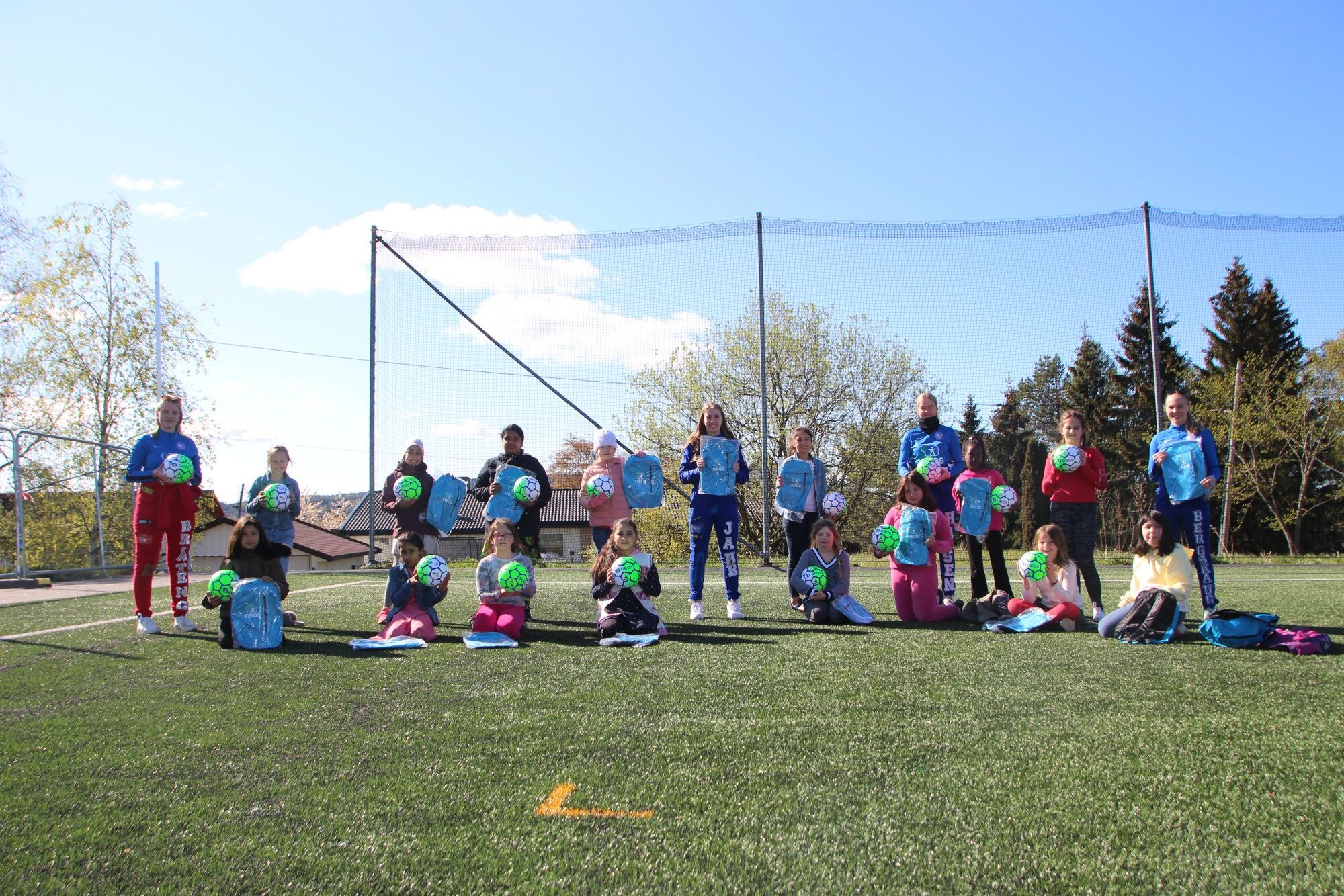 Deler ut fotballer til jentene