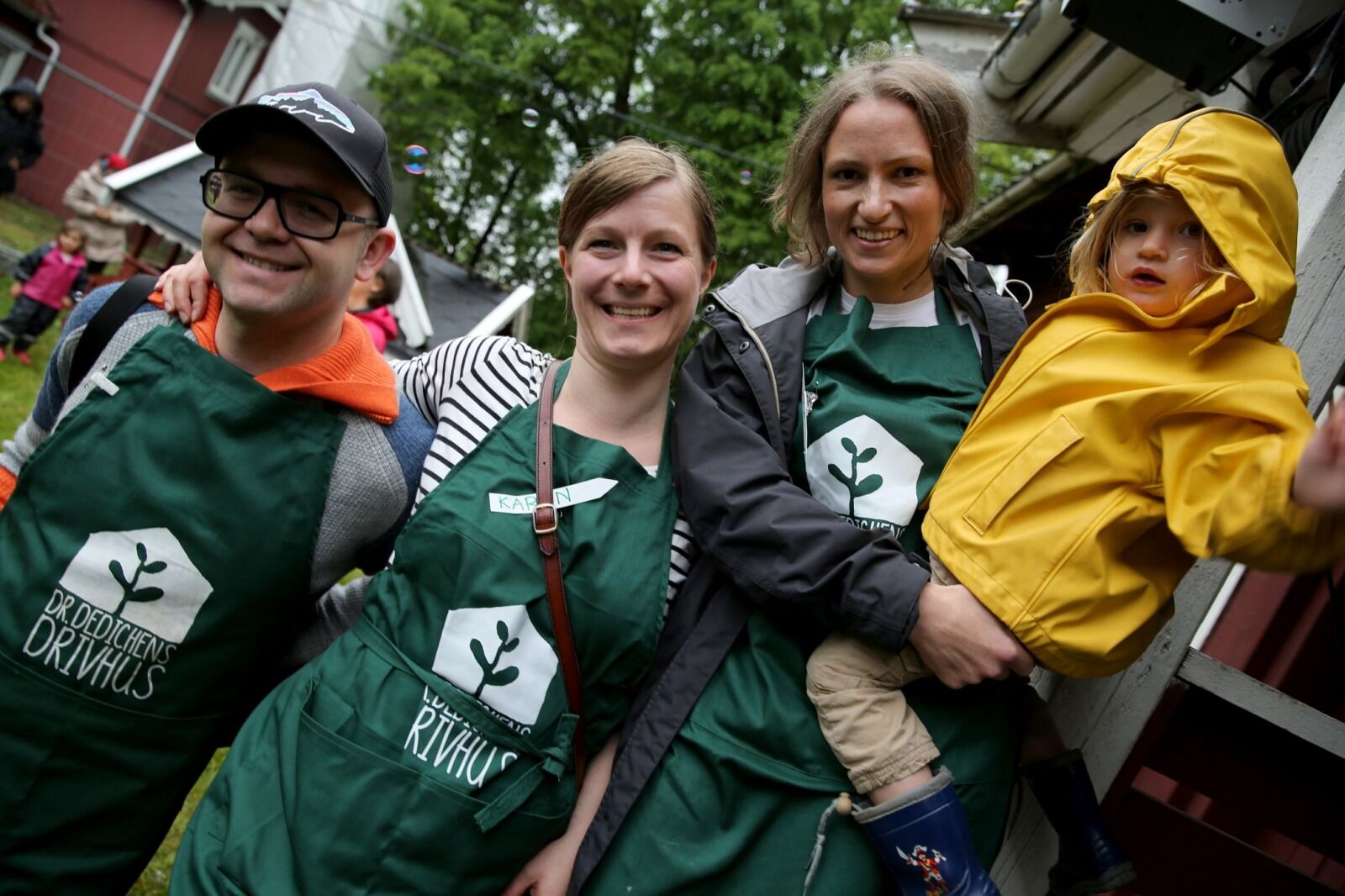 FORNØYD KVARTETT: Raymond Egge (f.v.), Karen Schønemann og leder Linda Vasaasen (med Oda) frydet seg over det store oppmøtet på markedsdagen. En sentral person i foreningen, dyrkingsansvarlig Michael Polcik, var ikke til stede da bildet ble tatt. Foto:Bilde 1 av 3