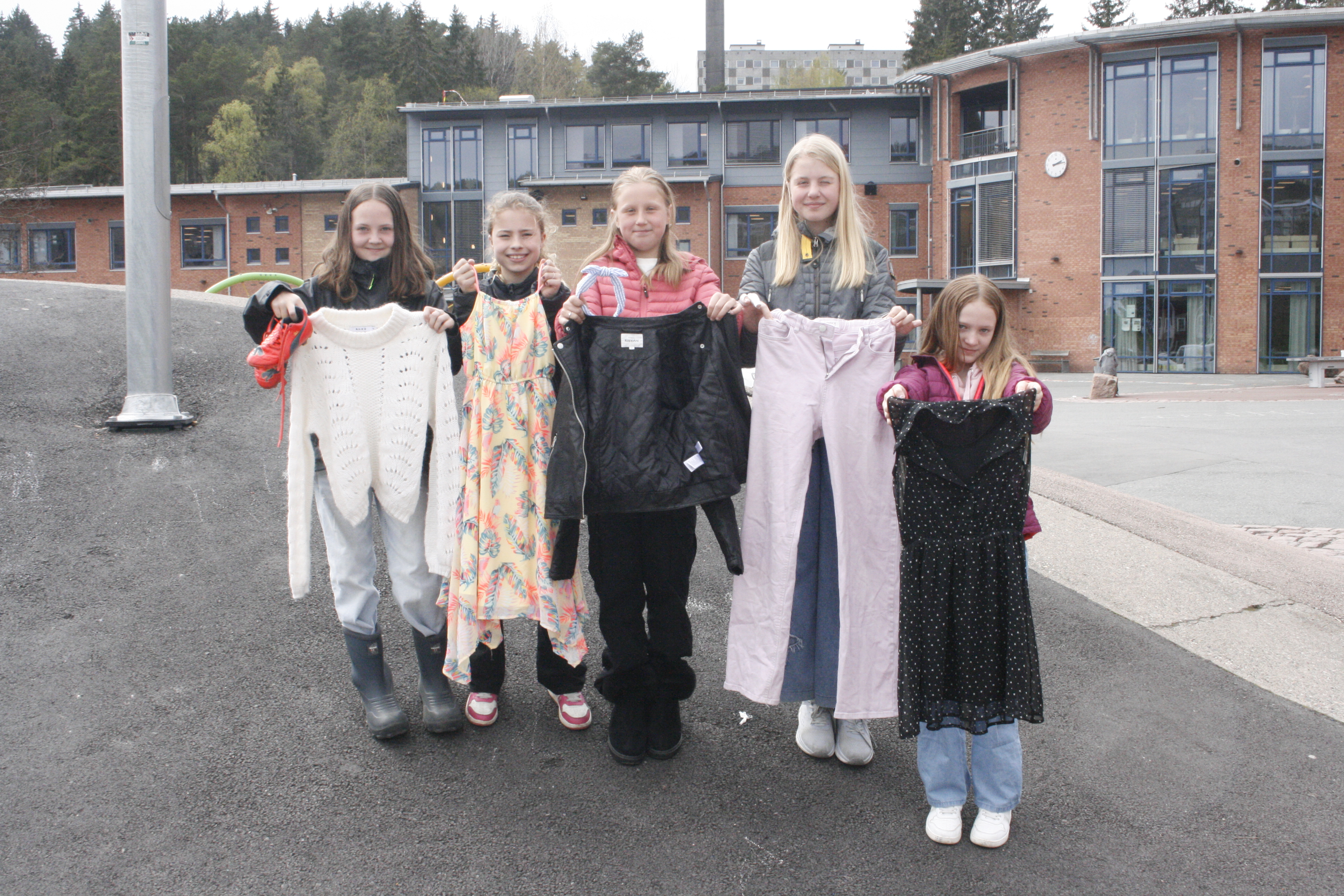 Jentegjengen Agathe (10), Henni (10), Frida (10), Tuva (11) og Øyunn (11) gleder seg til helgens byttedag. De har tidligere gått gjennom skap og kommoder for å finne gamle og lite brukte klær som de kan bytte til nye ting.