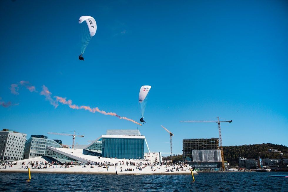 PARAGLIDERS: Det ble akrobatikk i lufta med paraglidere som hoppet fra et helikopter i lufta over Operataket. (Foto: Andreas Roksvaag) Foto:Bilde 1 av 7