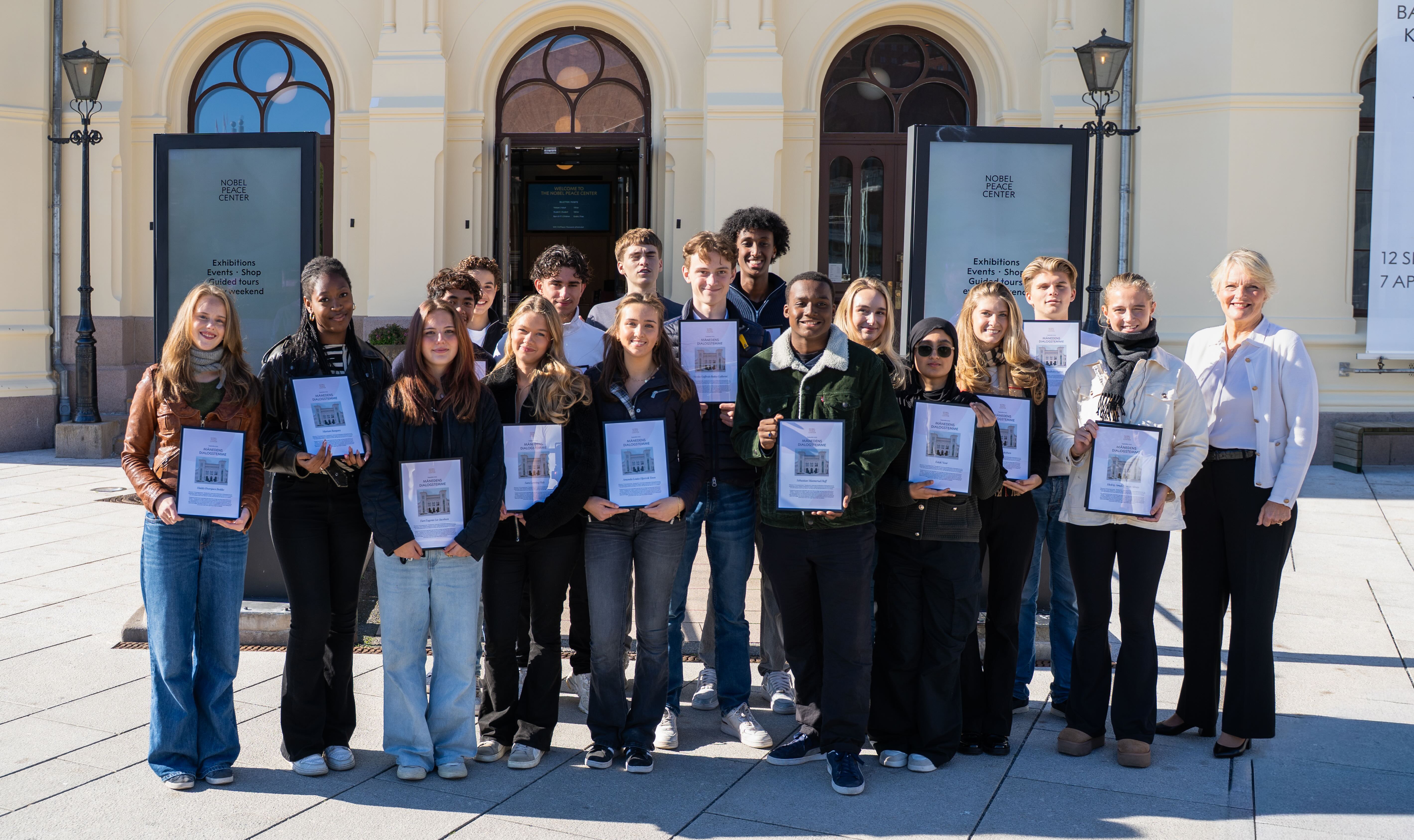 Hver måned gir Nobels Fredssenter en utmerkelse til noen som har gått i bresjen for god dialog, og for september er det ungdommene som var med i TV 2-serien «Skolebytte» som mottar utnevnelsen «Månedens dialogstemme». I serien møtes en halv skoleklasse fra henholdsvis Oslo Vest og Oslo Øst for å danne en ny, felles klasse. De utfordres på sine egne og hverandres fordommer, og tar opp vanskelige tema i en storbykontekst med store forskjeller. Gjennom lytting og spørsmål lærer de å forstå hverandre og bygge sterke relasjoner.