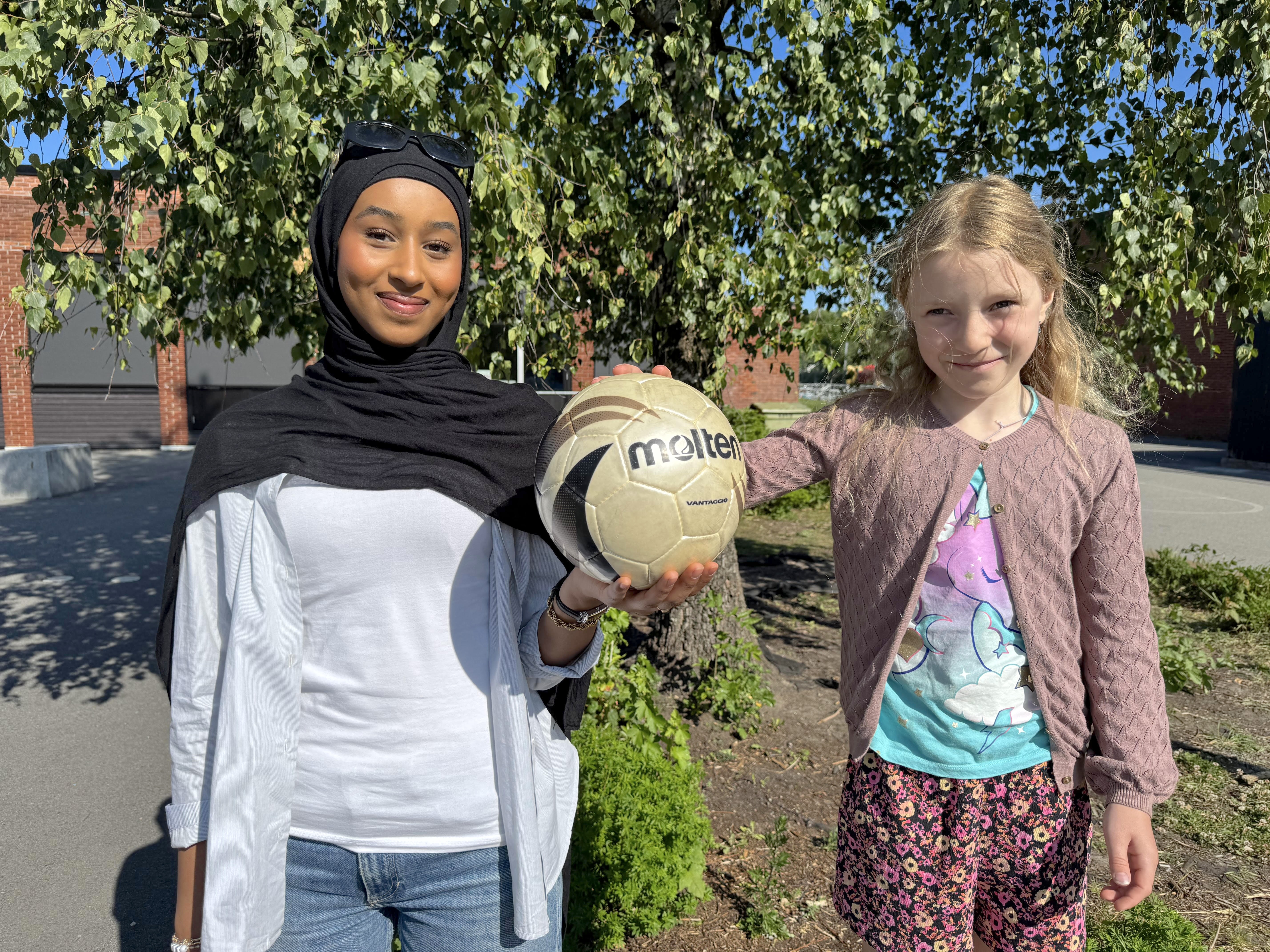 FANT TONEN: Ylva (9) og Leena (17) samarbeider om lek og læring under aktivitetsdagen. – Det er gøy å møte de store elevene, sier Ylva. – Og vi håper barna ser på oss som forbilder, sier Leena.Bilde 1 av 2