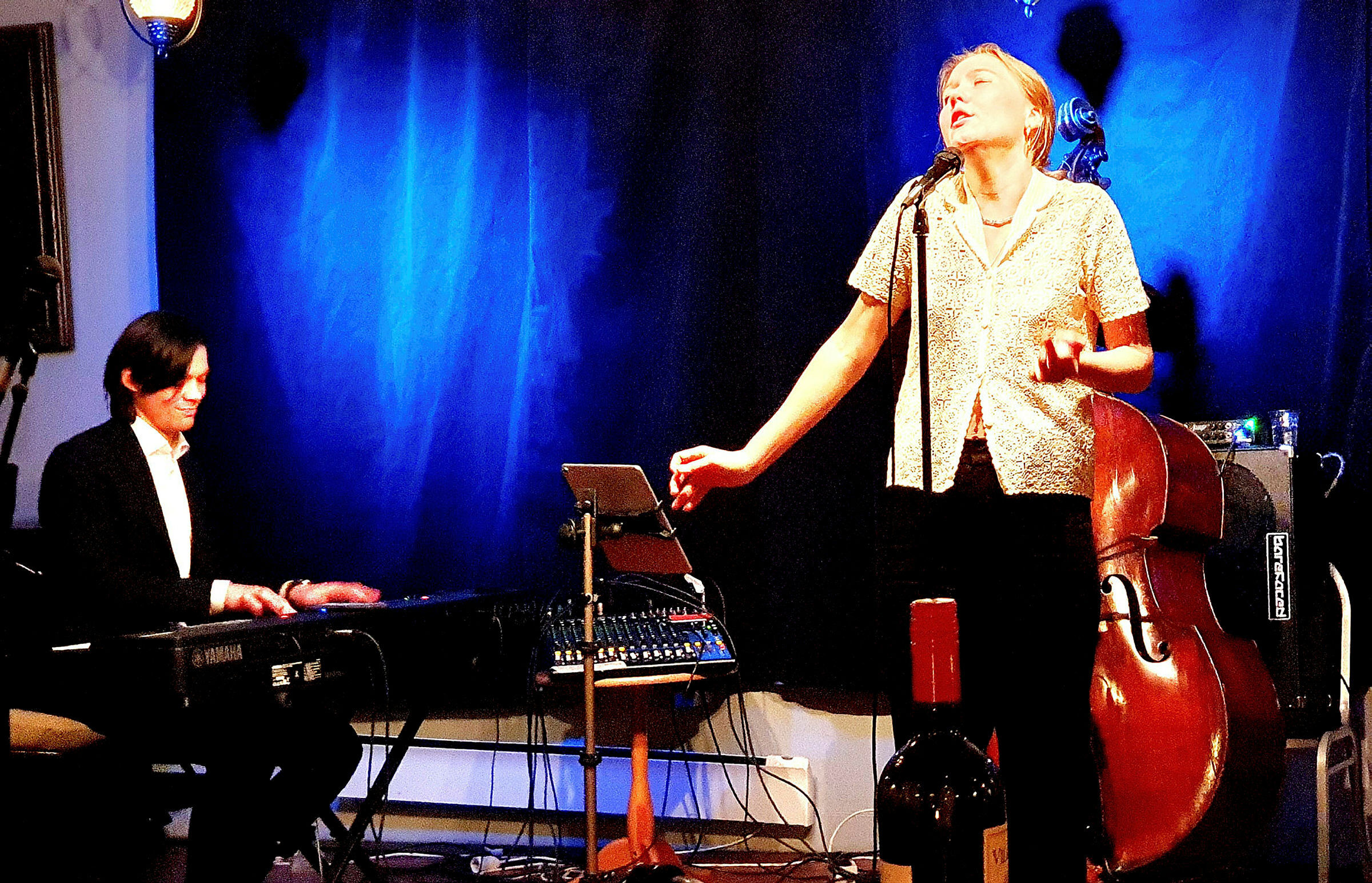 Da vi nærmet oss Vardeheim litt over kl. 20.00 hørte vi musikk og vokalisten helt ut i gården. Vi stusset, var de i gang allerede? Nei da, det var lydprøver på gang. Da vi kom inn i salen var det litt glissent ved bordene, men det dukket opp flere etter hvert. Og det ble slett ikke dårlig frammøte. Og glade var vi som hadde kommet denne kvelden.