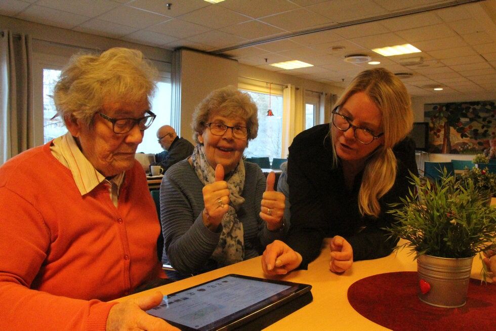 TIPP TOPP: Det nye digitale verktøyet kan brukes på både telefon, iPad og PC. Onsdag ble det gitt ut informasjon og kursing av seniorene. Her med Eva Olstad, Berit Waaler og Tone Wang. Foto:Bilde 1 av 1