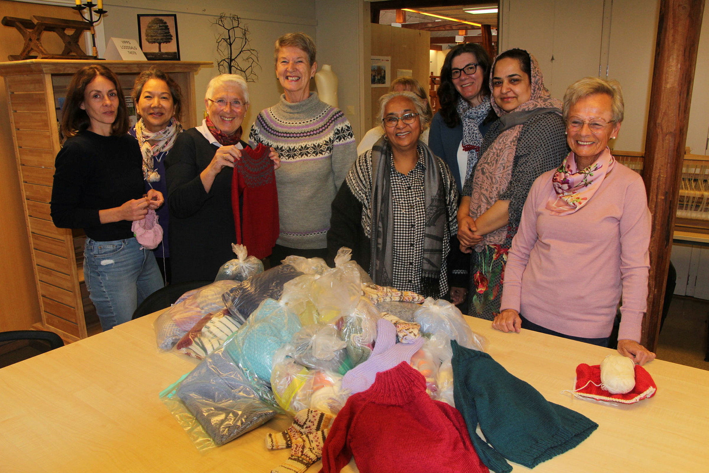 STOVNER: Østre Aker Husflidlag har en trivelig strikkekafé der en gjeng med lokale møtes en gang i måneden og hygger seg sammen mens de strikker. Mye av strikketøyet donerer de til veldedige formål. Her har brukerne på kafeen lagt fram neste ukes leveranse til Amandaprosjektet. Foto: Sindre Veum ApnesethBilde 1 av 1