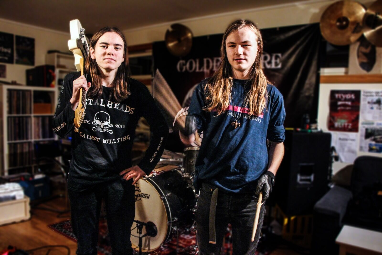 HJEMMEBANE: Gitarist Simen Jakobsen Harstad (15) og trommist og vokal Johannes Thor Sandal (17) hjemme på Ammerud. Kjellerstua er omgjort til et lite øvingsrom der gutta spiller og øver. 1. november slapp de nytt album. Albumet har vært en krevende prosess, men sluttresultatet ble til gjengjeld svært bra. Foto:Bilde 1 av 1
