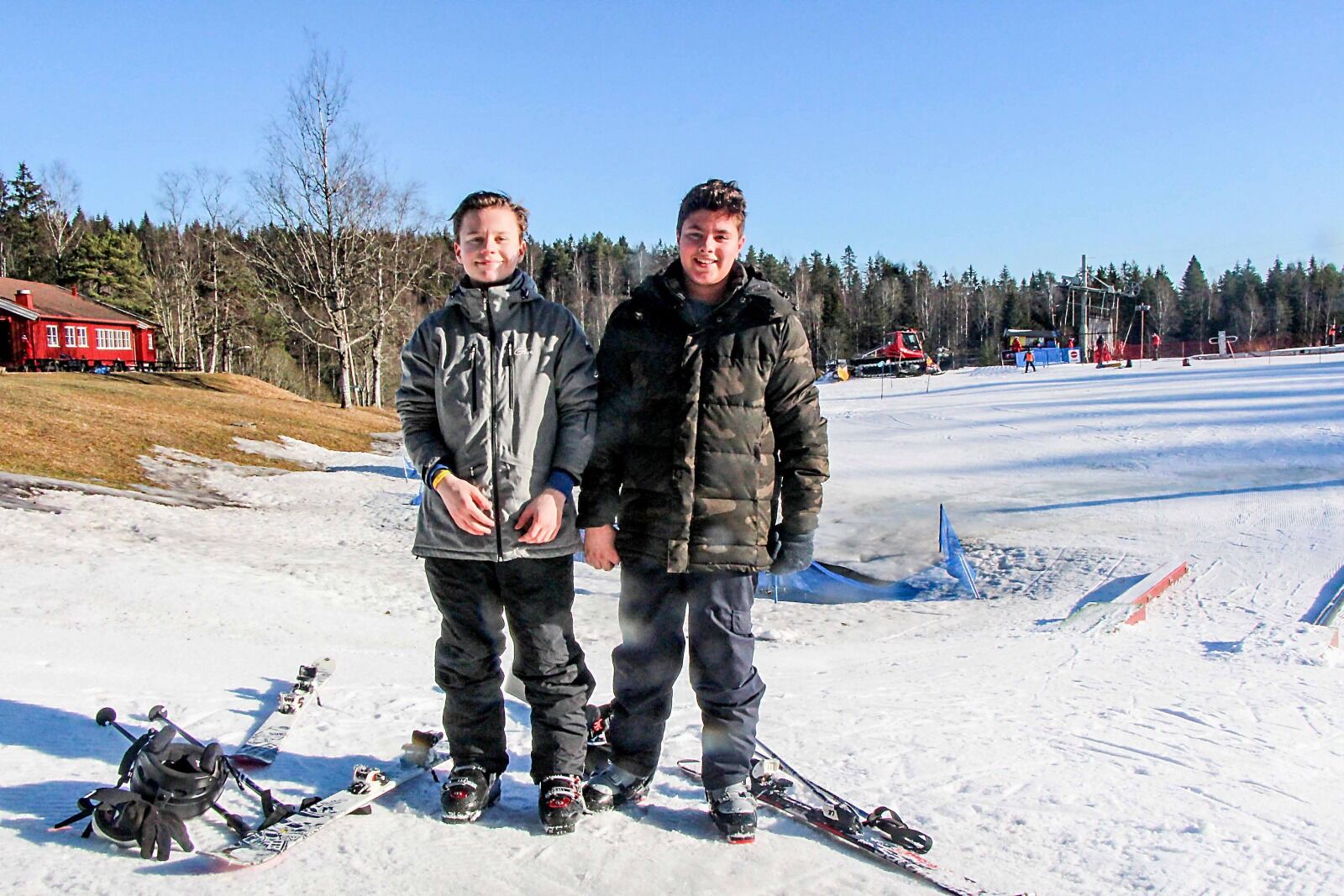 Årvoll-siden i Oslo Skisenter holder stengt på grunn av lite snø, men på Trollvann-siden var det full rulle. Noen nøt finværet i solveggen ved Trollstua, andre hygget seg rundt bålet, men det var i slalåmbakken man fant de bredeste glisene. Oppsal-kompisene Adam Radwan (12) og Brynjar Indreeide (12) var i bakken allerede klokka elleve.
