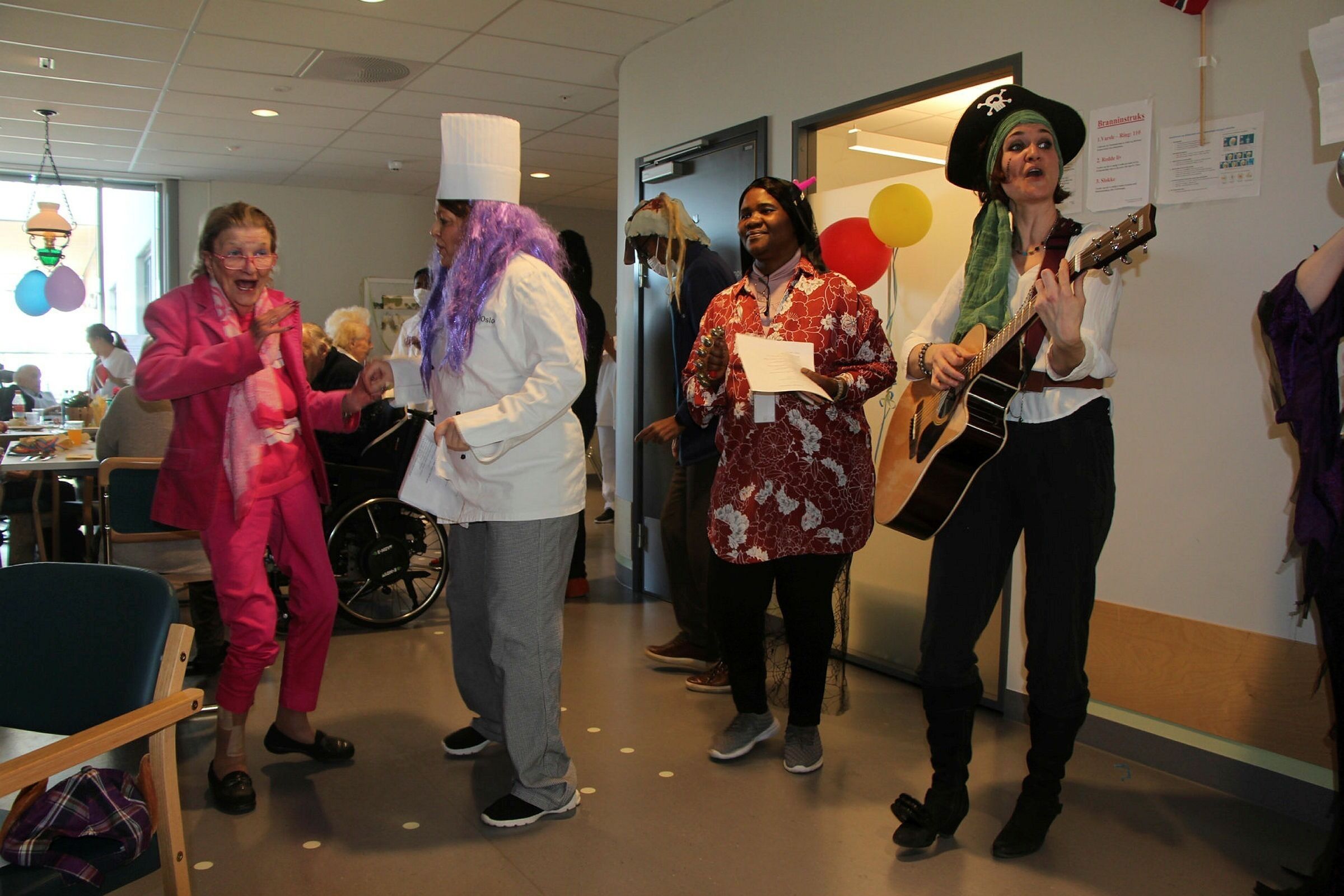 KARNEVALSFEIRING: Lindeberghjemmets ansatte hadde kledd seg ut og arrangerte karnevalsfeiring på langtidshjemmet med musikk og dans på avdelingene. Foto:Bilde 1 av 2