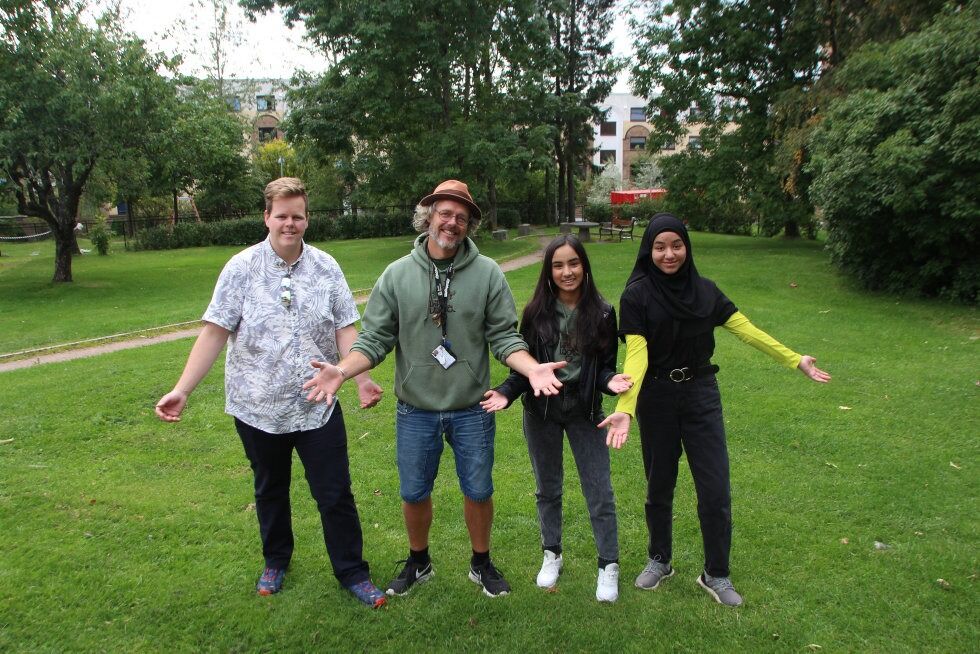 STOR EPLEFEST: Adrian Olafsen, Åsmund Gylder, Lojain Al-jabri og Arina Aamir inviterer til Midgardsfest på Nedre Fossum gård, som en markering på den offisielle epledagen. Foto:Bilde 1 av 1