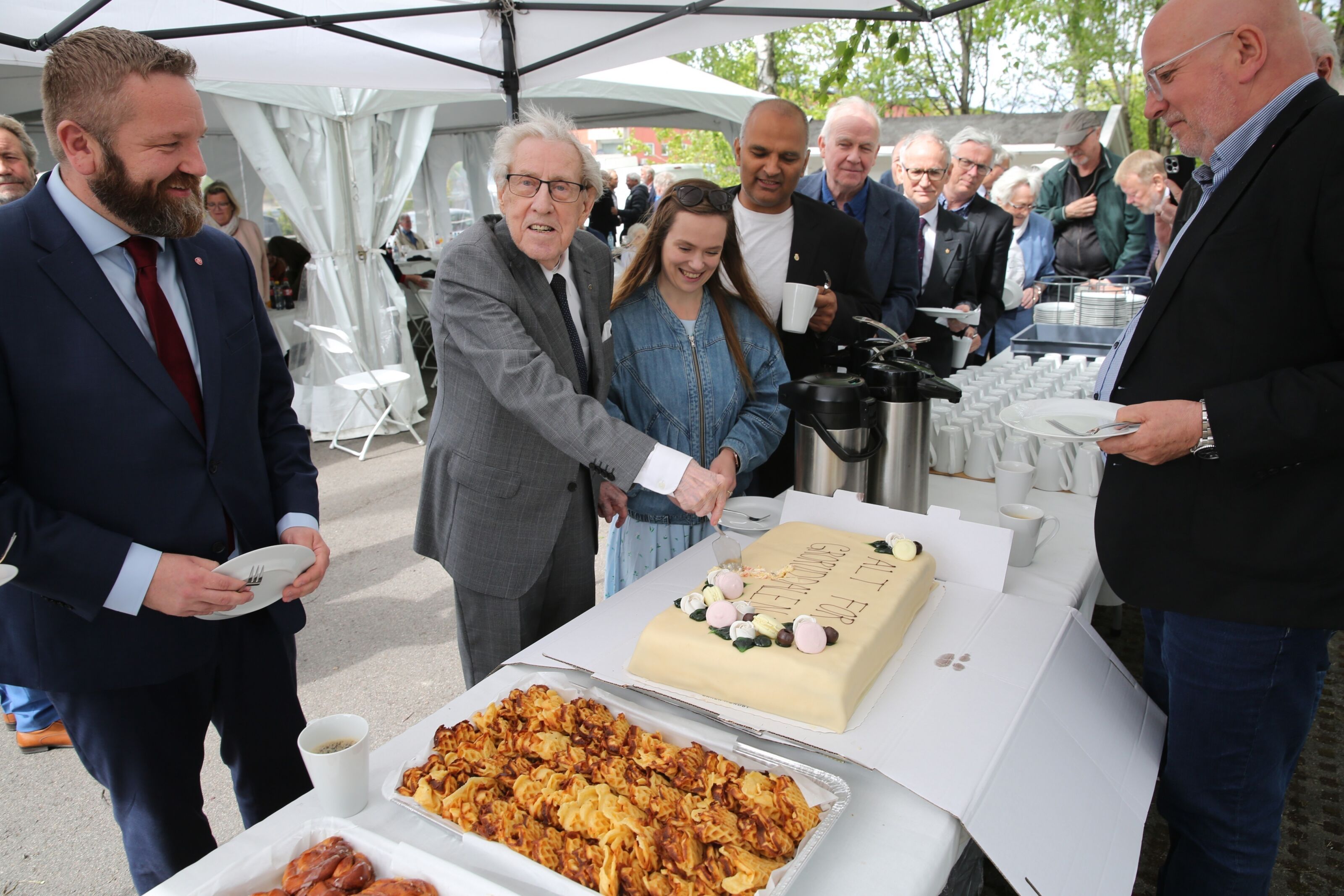 JUBILEUMSKAKE: «Alt for Groruddalen» var å finne på både kake, seil og medaljer som ble delt ut. Det første kakestykket tok jubilanten Hjalmar Kielland sammen BU-lederne – og det viste seg at Mari Morken har bursdag samme dag som 90-åringen. Selv fylte lederen i Alna bydelsutvalg 28 år. Foto: Rolf E. WulffBilde 1 av 5