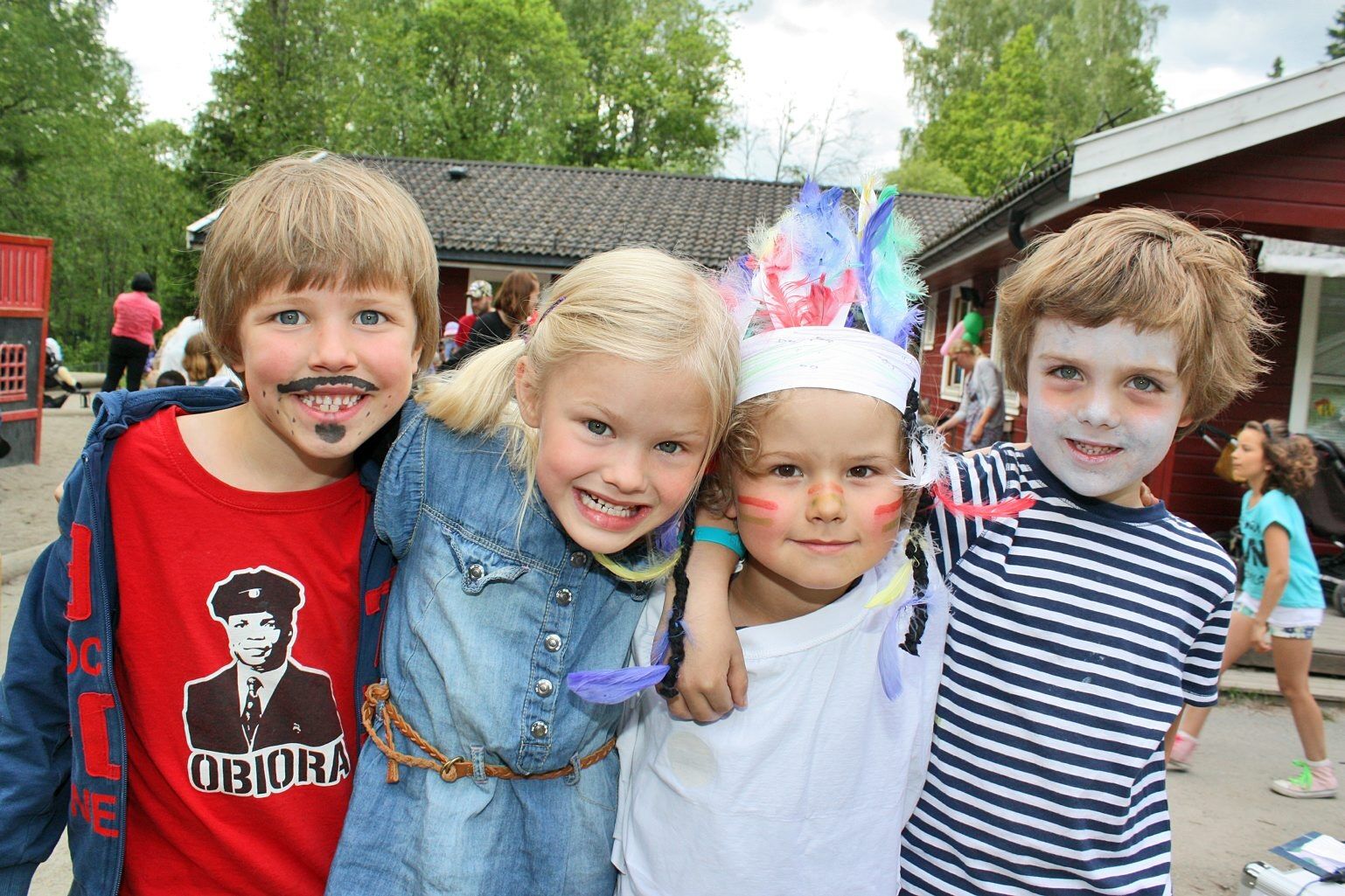 Jonatan, Emilie, Julian og Jonas kledde seg ut i kostymer i anledning 20-årsjubileet til Lillomarka barnehage.
