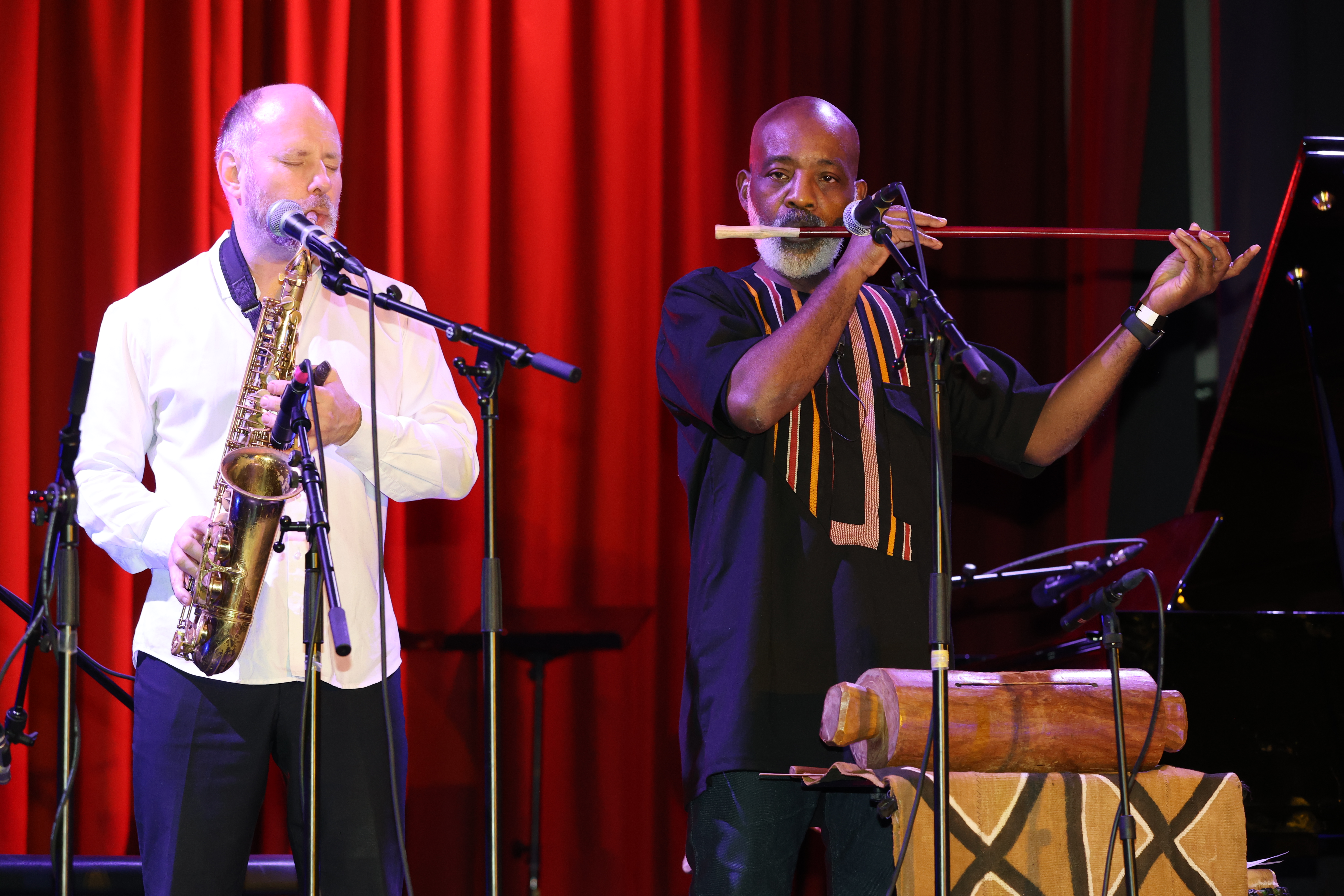MULTIKULTURELL FEST: Feiringen av vintersolverv i Grorud samfunnshus samlet over 200 publikummere til en kveld fylt med musikk, dans og kulturelle innslag fra hele verden. Her spiller Rolf-Erik Nystrøm og Kouame Sereba. Foto: Tom Evensen. FOTO: Tom EvensenBilde 1 av 1
