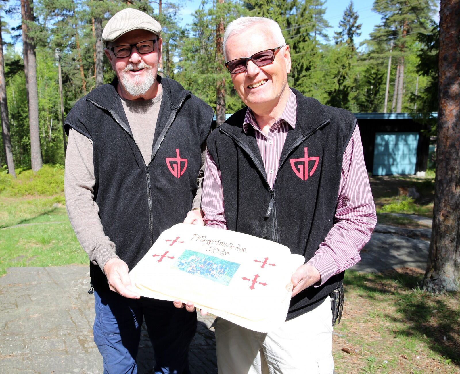 SERVERTE JUBILEUMSKAKE: Dobbelt jubileum og feiring for pilegrimsleden. Da stilte leder av Groruddalen Historielag, Dan Brovold, og historielagets frontfigur i forbindelse med pilegrimsleden gjennom dalen, Jan Arne Tangerud, med jubileumskake. Foto:Bilde 1 av 3