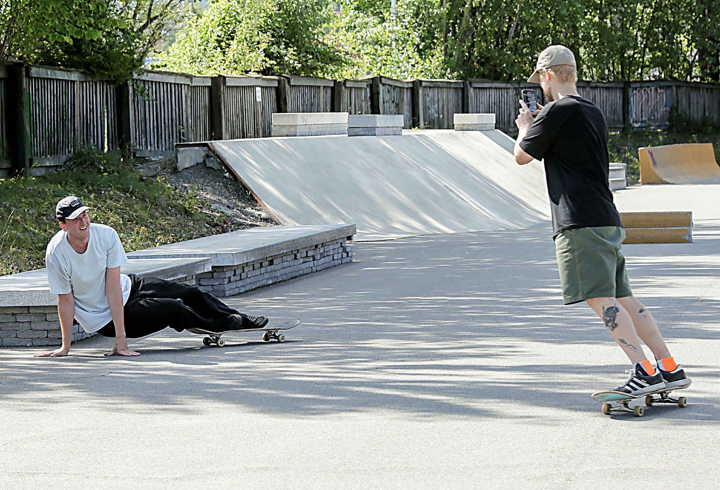 I Haugenstua skatepark er det full aktivitet for tiden. Det rulles, hoppes og trikses – og til og med filmes!