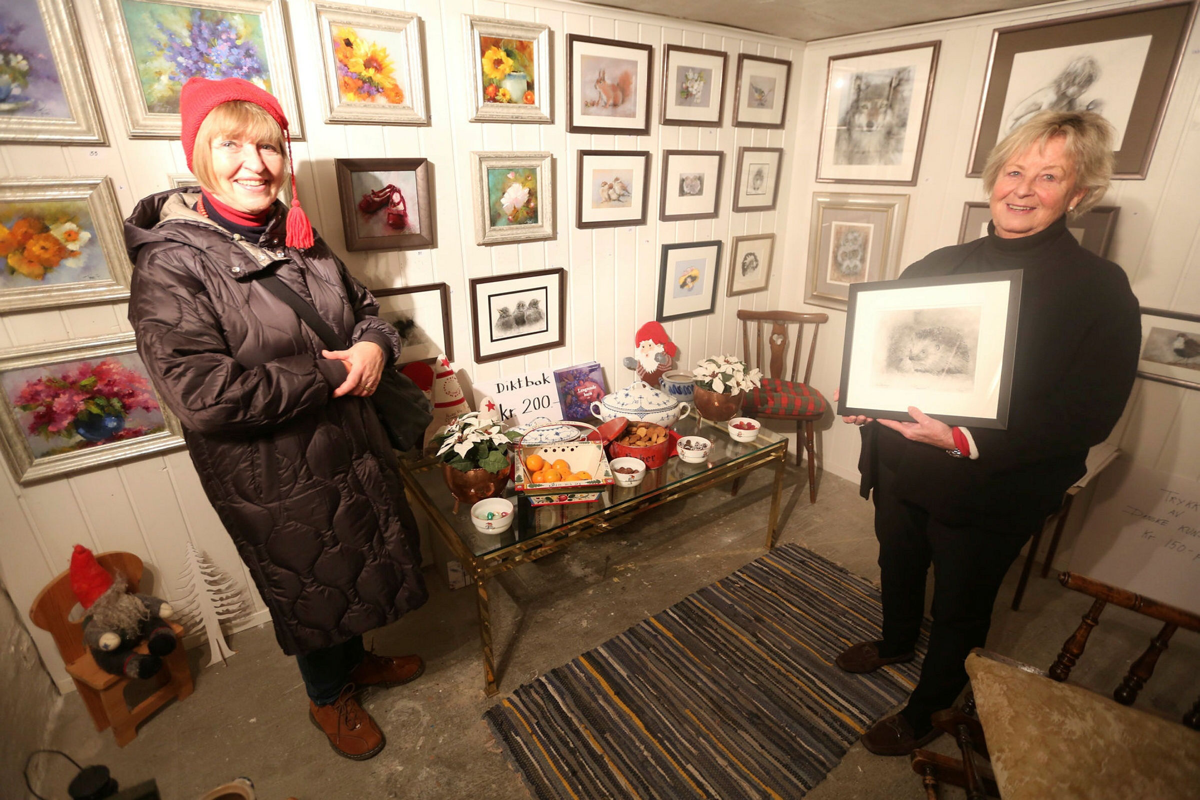 TRADISJONELL JULESTART: Først når Anja Werrmskog har besøkt Trine Pedersen og hennes tradisjonelle juleutstilling, føler hun at advents- og juletida har startet. Her i et av kunstrommene i de atmosfæriske kjellerlokaleomgivelsene. Kulltegningen av pinnsvinet som Trine viser fram har blitt vurdert og fått stor anerkjennelse i de kunstneriske miljøer, og ble fort solgt i løpet av årets juleutstilling. Foto: Rolf E. WulffBilde 1 av 1