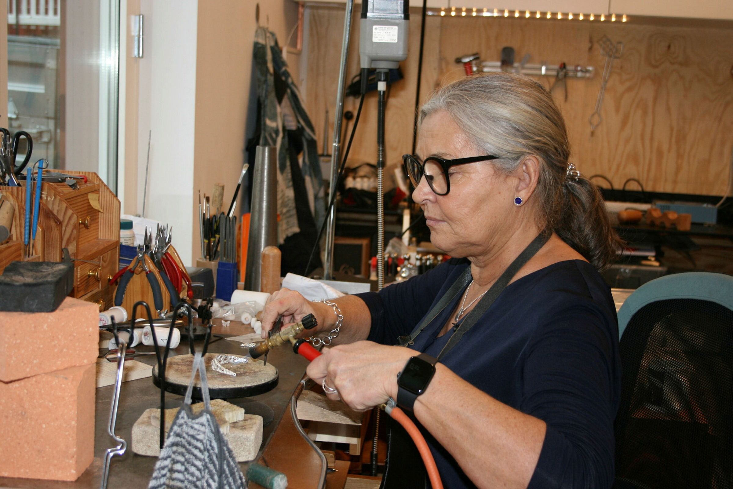 DRIFTIG ARBEID: Sølvsmed Anita Schulte er i butikken på Årvoll tre dager i uka. Når avisa stikker hodet innom er hun midt i arbeidet med å forvandle en gammel sukkerklype til et helt unikt armbånd. Foto: Caroline HammerBilde 1 av 2For å se disse bildene må du ha et abonnement Former gamle skjeer til fine smykker Caroline Hammer Publisert 3. nov 21 kl. 15:10 Del på sosiale medier Del Facebook Twitter E-post Nyhetsbrev Facebook Instagram Abonnement