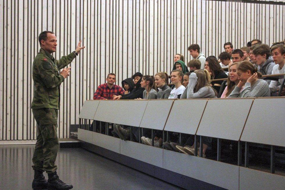 NÅDDE FRAM: Major Eldar Frøland sammen med Bjerke-elevene i auditoriet på Krigsskolen. Kaja Hamang, første rad med hvit genser, gir besøket tommel opp. Foto:Bilde 1 av 1