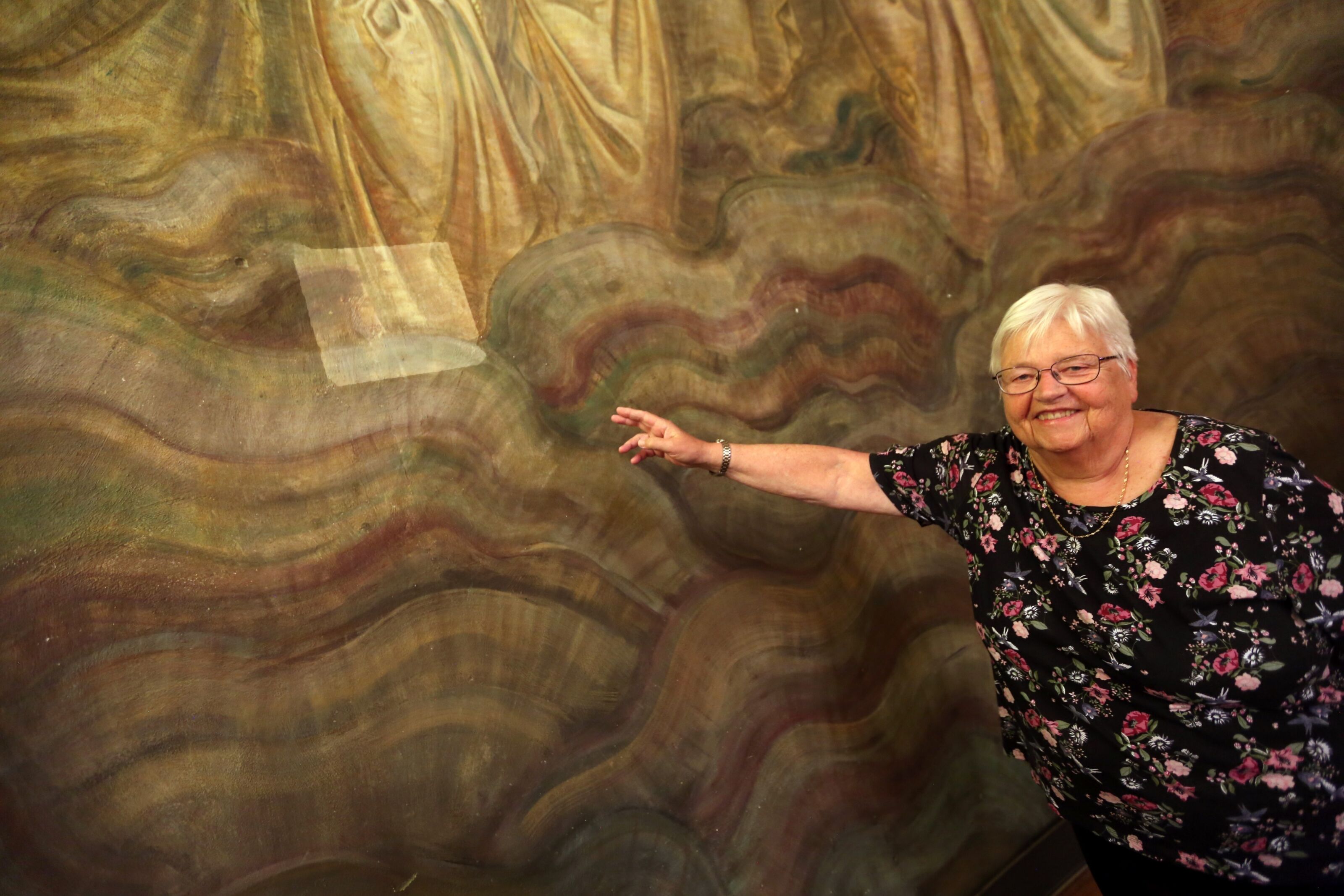 Birgit Jøkling peker mot den lille delen av det enorme freskomaleriet som har blitt tydelig lysere. Men den delen var stor nok til å foreta en tilstandsvurdering, utarbeide behandlingsforslag og komme med et prisestimat for full oppussing av maleriet til Per Vigeland i Grorud kirke. Foto: Rolf E. WulffBilde 1 av 2