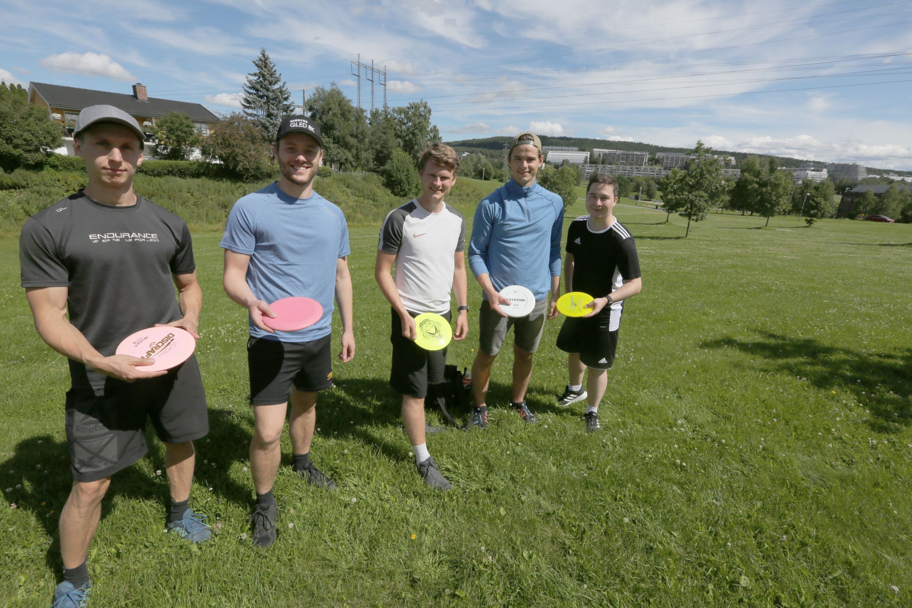 Solen skinner over frisbeegolfbanen på Stovner. Ved utkastpunktet i Margrethe Parms vei, der du tar inn til gamle Rommen skole, står fem gutter klare til å sende sin frisbee av gårde mot kurven 106 meter unna.