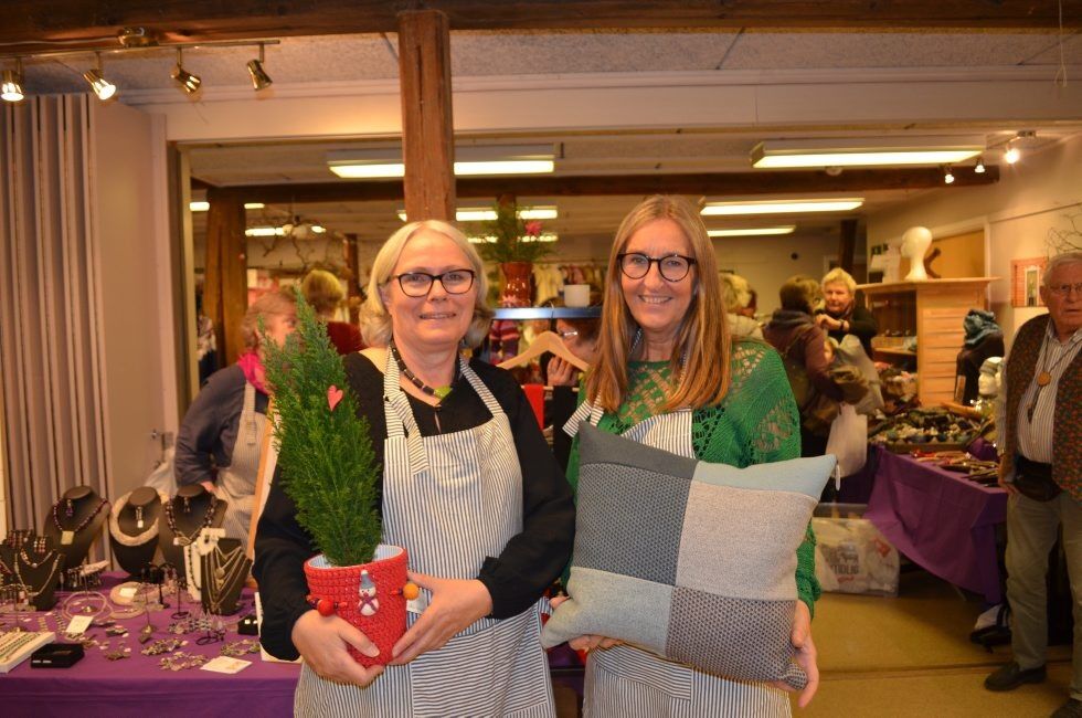 STORT MARKED: Leder for Østre Aker husflidslag, Bente Faustino og leder for markedskomiteen, Kari Jarrett viser fram noe av det de solgte på det store markedet på Øvre Fossum gård. Foto:Bilde 1 av 1