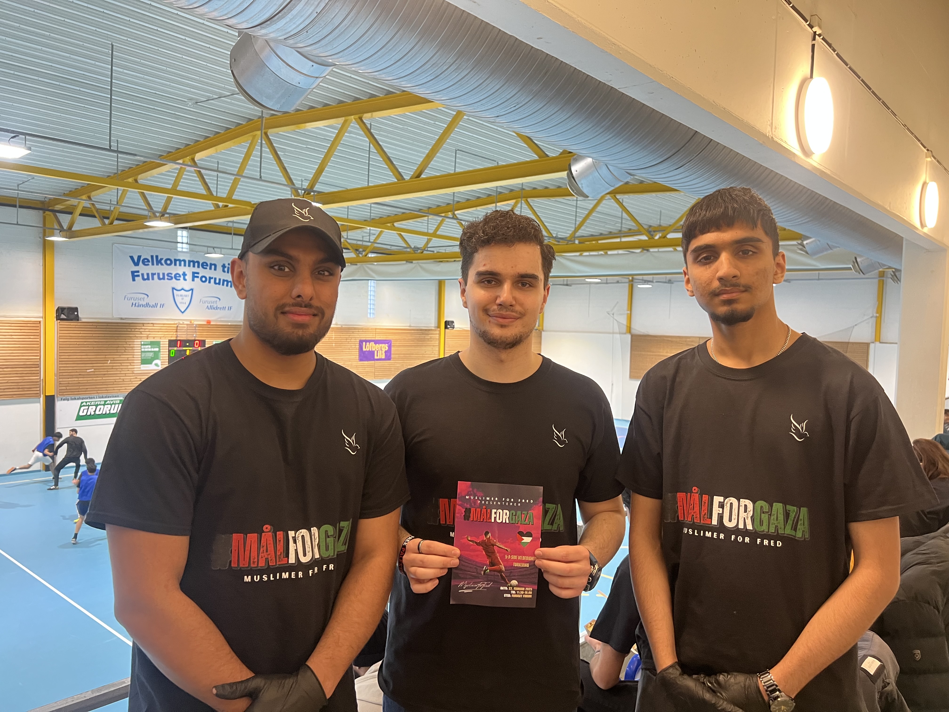 FOTBALL FOR GAZA: Saboor Qadir (f.v.), Armaan Lindstrøm, Basere Ahmad viser solidaritet til dem som trenger hjelp i Gaza, gjennom dette arrangementet i Furuset Forum.Bilde 1 av 3