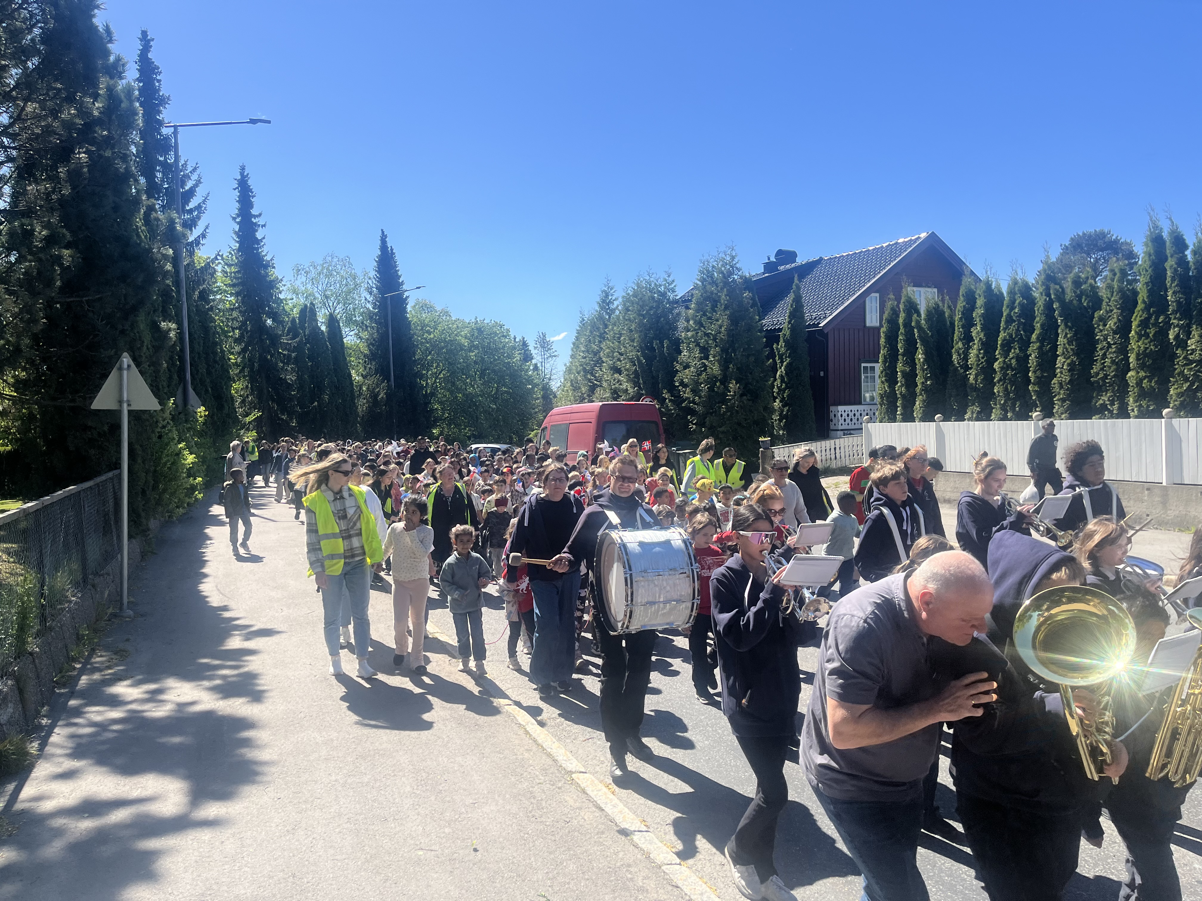 Trivelig 17. mai-stemning i Groruds gater fredag ettermiddag med Grorud skole og Grorud skoles musikkorps.