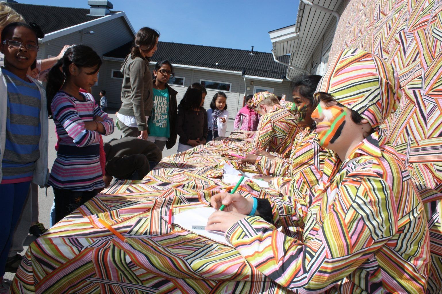 Et utvalg skoleelever fikk muligheten til å bli med på kunstprosjektet. Iført identiske kostymer ble de plassert foran forheng som også hadde samme mønster, og fremsto som tablåer i skolegården. Men ifølge tekstilkunstneren bak kunstprosjektet «Ser du hva jeg ser?», Svein Ove Kirkhorn, visste ikke noen av de andre elevene hva som ventet dem da de løp ut til storefri på onsdag.
