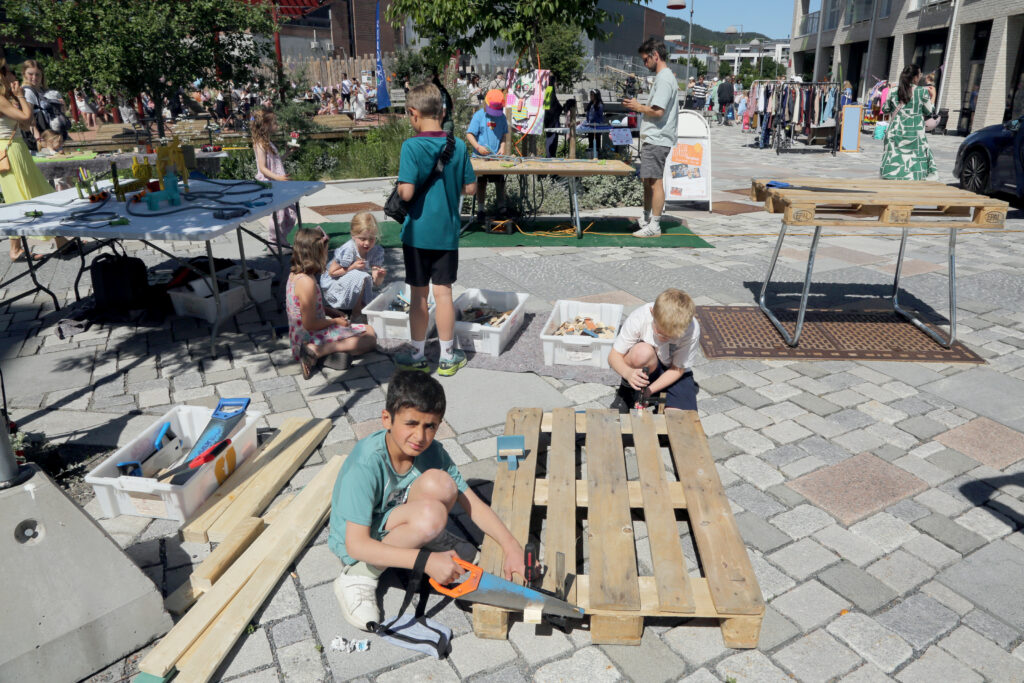 Det tar heller ikke lang tid før djembe, blokkfløyte og gitartoner fyller torget. Det er Trio Oro som har satt i gang og som serverer musikk fra hele verden. Samtidig hamres det løs ikke langt fra dem. Der tilbyr Vieralle morosløyd, hvilket fort trekker til seg hamrende og sagende «håndverkere» av ung alder.