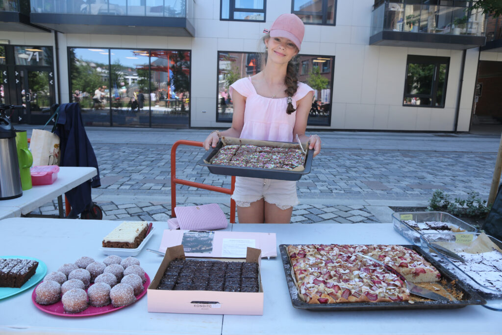 Rett ved står Julia (14) og frister de mange tilstedeværende med et vell av kaker.