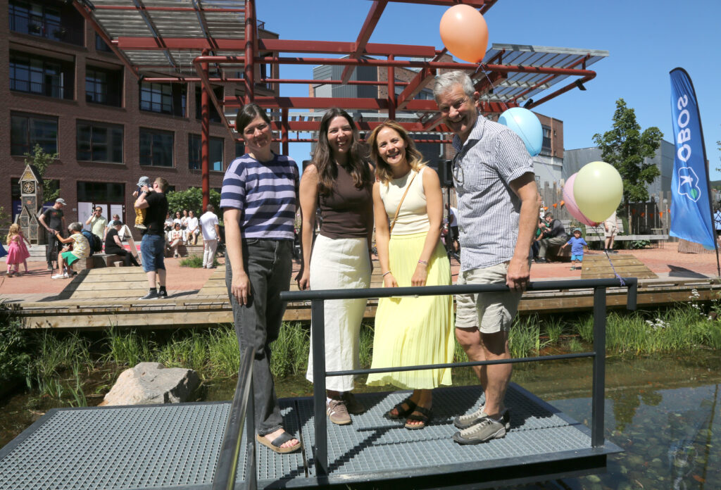BLIDE OBOSFJES: Katrin Schauer (f. v.), Ane Volla, Kine Steien og Martin Arentz-Hansen er til sammen prosjektsjefer, ledere og assistent på ulike deler av det totale Vollebekk-prosjektet til OBOS. De hadde all grunn til å smile om kapp med sola etter en ny vellykket torgfest. FOTO: Rolf E. Wulff